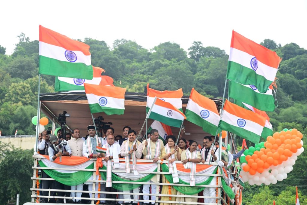 मुख्यमंत्री डॉ. मोहन यादव, भारतीय जनता पार्टी के प्रदेश अध्यक्ष व विधायक श्री हेमंत खंडेलवाल एवं प्रदेश संगठन महामंत्री श्री हितानंद जी ने ‘हर घर तिरंगा’ अभियान अंतर्गत बोट क्लब में आयोजित ’नौका तिरंगा यात्रा में शामिल होकर शुभकामनाएं दी। इस अवसर पर प्रदेश शासन के मंत्री श्री विश्वास सारंग, श्रीमती कृष्णा गौर, महापौर श्रीमती मालती राय, प्रदेश मीडिया प्रभारी श्री आशीष उषा अग्रवाल, जिला अध्यक्ष श्री रविंद्र यति, निगम अध्यक्ष श्री किशन सूर्यवंशी, पूर्व विधायक श्री ध्रुव नारायण सिंह सहित पार्टी पदाधिकारी और कार्यकर्ता बड़ी संख्या में उपस्थित रहे।