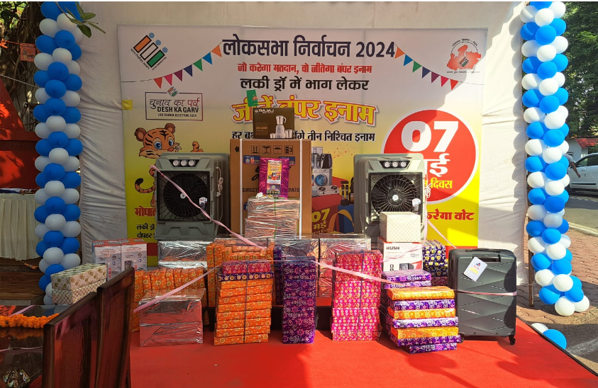 भोपाल में मतदान प्रतिशत बढ़ाने के लिए इस बार पूरे दिन 3 ड्रा खुलेंगे। सुबह 10 बजे पहला ड्रॉ खोला गया। चार इमली स्थित बूथ पर ड्रॉ में डायमंड रिंग, डिनर सेट और मिक्सर गिफ्ट में दिया गया। डायमंड रिंग यागोज साहू ने जीती। वहीं, डिनर सेट नीरज पांडे और मिक्सर जगदीश प्रसाद को मिला।