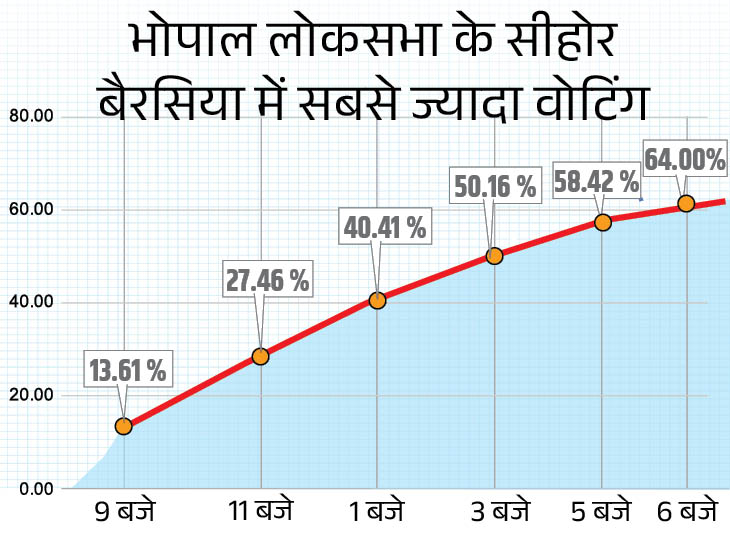 भोपाल लोकसभा सीट पर 64 प्रतिशत वोटिंग हुई। 2019 में 65.65 प्रतिशत वोटिंग हुई थी, जो 61 साल में सबसे अधिक थी। सबसे अधिक वोटिंग 75.67 फीसदी सीहोर विधानसभा में हुई। दूसरे नंबर पर बैरसिया में 73.08 प्रतिशत वोट डाले गए।