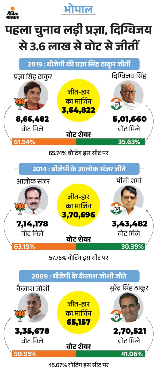 पिछले तीन चुनाव में किसको कितने मत मिले