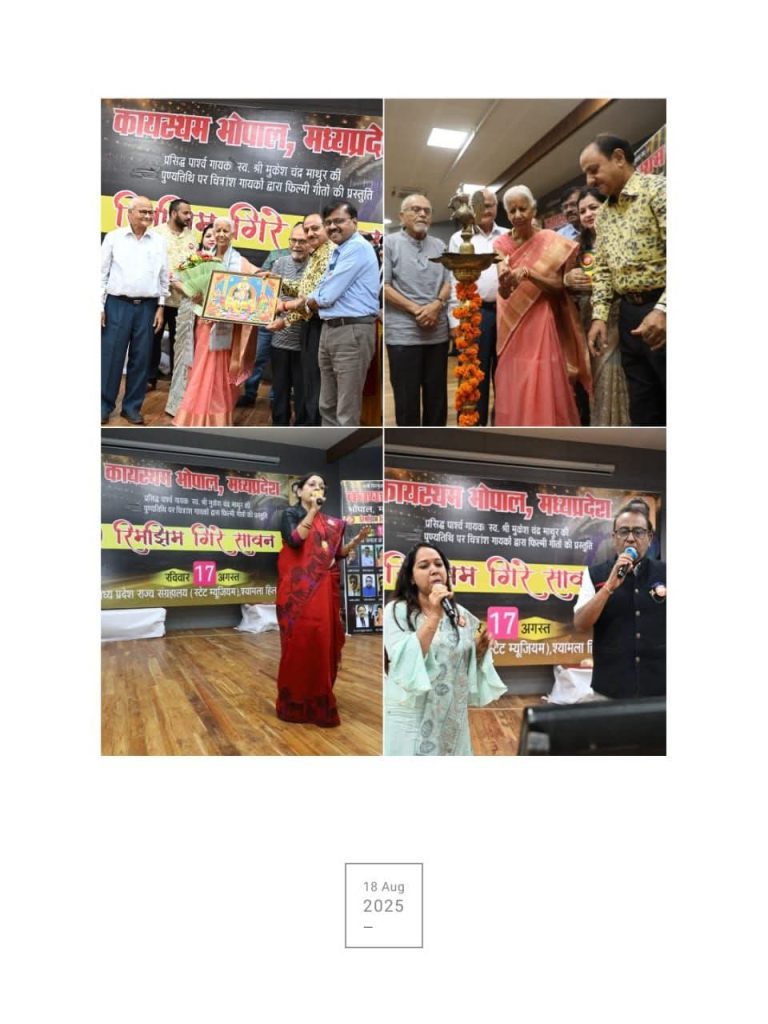 मध्य प्रदेश में कायस्थ समाज की अग्रणी लोकप्रिय संस्था कायस्थम द्वारा राजधानी भोपाल में पार्श्व गायक देश के लोकप्रिय गायक स्वर्गीय मुकेश जी की पुण्यतिथि के अवसर पर संगीत कार्यक्रम रिमझिम गिरे सावन संगीत भरे इस आयोजन में पधारी मुकेश जी की मौसी मीनाक्षी माथुर ने कार्यक्रम का दीप प्रज्वलित कर शुभारंभ किया । संभवतः मध्य प्रदेश में अभी तक का यह पहला अनोखा कार्यक्रम था । इस अवसर पर के समाज के अनेक प्रतिभाशाली गायकों ने अपनी प्रस्तुति दी । इस अवसर पर दैनिक भास्कर के वरिष्ठ पत्रकार महेश श्रीवास्तव भजन गायक रवि खरे वरिष्ठ पत्रकार मलय श्रीवास्तव कायस्थ समाज के वरिष्ठ अधिकारी गण चिकित्सक वकील व्यवसाई एवं गणमान्य नागरिक उपस्थित है । इस सफल आयोजन के लिए कार्यक्रम के सभी पदाधिकारी बधाई के पात्र हैं ।