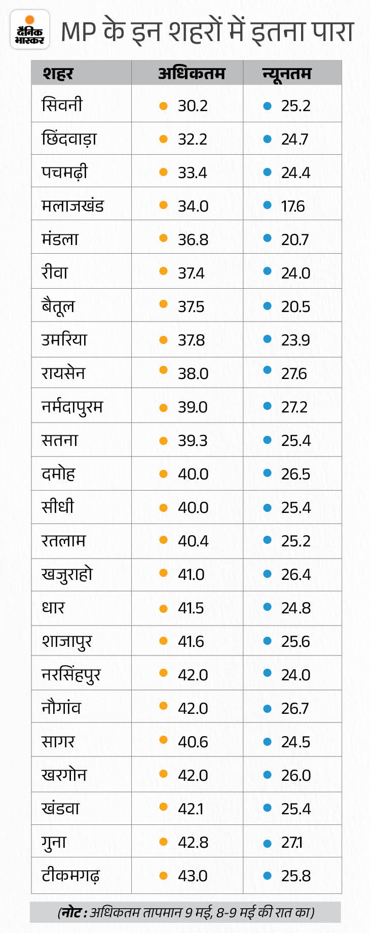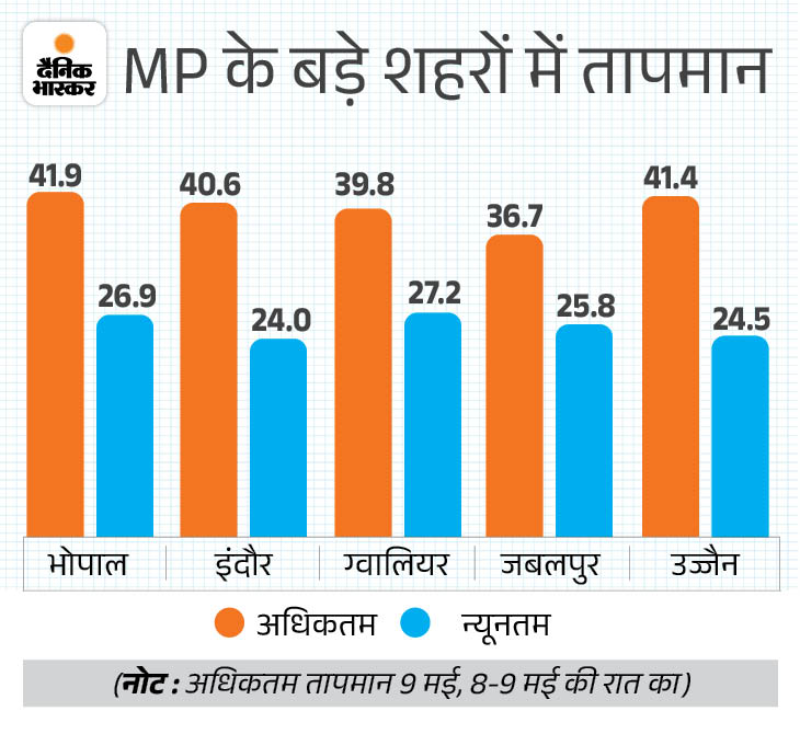 - बड़े शहरों की बात करें, तो भोपाल में तापमान 41.9 डिग्री रहा। राजधानी में शाम को मौसम में बदलाव हुआ। इंदौर में 40.6 डिग्री, ग्वालियर में 39.8 डिग्री, जबलपुर में 36.7 डिग्री और उज्जैन में पारा 41.4 डिग्री सेल्सियस दर्ज किया गया।
