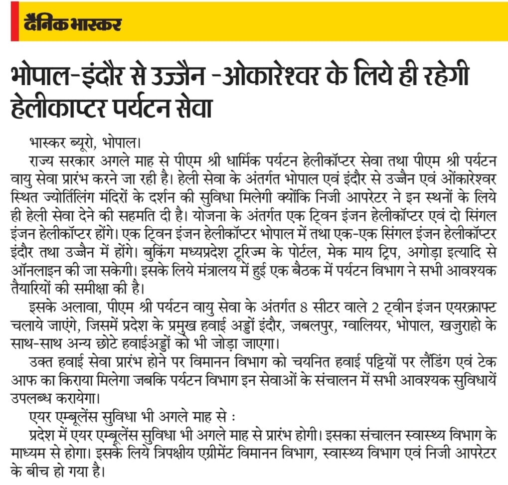 राज्य भोपाल -इंदौर से उज्जैन ओंकारेश्वर के लिए ही रहेगी हेलीकॉप्टर सेवा admin May 12, 2024 0 Spread the love– Post navigation Previous: कनिष्ठों को युवाओं को अपार स्नेह के साथ हनुमान जी पर कृतज्ञता के लिए आयोजित सुंदर कांड कथा में आत्मीय निमंत्रण,Next: सागर और इंदौर जिले के बाल गृह संभाग स्तरीय घोषित More Stories राज्य क्रांतिवीर राजाओं और जनजातीय योद्धाओं के स्मरण का महापर्व है शौर्य यात्रा admin April 25, 2026 0 राज्य मंत्री के भाई ने लेडी CEO को धमकाया, मारने दौड़े admin April 25, 2026 0 राज्य महिला ने बेटे और दोस्त से सहेली का रेप कराया admin April 25, 2026 0 Leave a Reply Cancel replyYour email address will not be published. Required fields are marked *Comment * Name * Email * Website Save my name, email, and website in this browser for the next time I comment. Δ