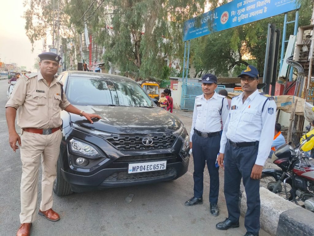 नगरीय पुलिस उपायुक्त यातायात एवं वरिष्ठ अधिकारियों के मार्गदर्षन एवं पर्यवेक्षण में बैरागढ़ क्षेत्र में यातायात व्यवस्था का कार्य सउनि- सुनील पाठक, प्रधान आर-1196 लक्ष्मण, आरक्षक-4321 विरेन्द्र सिंह द्वारा संपादित किया जा रहा था। इस दौरान नो-पार्किंग क्षेत्र में खडी कार नम्बर-एपी 04 ईसी 6575 पर कार्यवाही के लिए पीओएस मषीन से सर्च करने पर वाहन मालिक को फोन लगाया गया जिस पर वाहन मालिक ने गाडी के साथ बेरसिया में होना बताया गया। गाडी को संदिग्ध होने पर उस पर नजर रखी गई। कुछ समय पष्चात एक व्यक्ति आया जिसने उक्त कार अपनी होना बताया। पता पुछने पर उसने अपना नाम-आदित्य सिंह उम्र-36 वर्ष निवासी टी 4 मोहिनी होम्स सर्वधर्म कालोनी कोलार रोड़ बताया। सख्ती से पूछताछ करने पर उसने फर्जी नम्बर प्लेट लगाकर वाहन चालान स्वीकार किया। तब कार एवं व्यक्ति को बैरागढ थाने ले जाकर कार जप्त कर संबंधित व्यक्ति के विरूद्ध थाना बैरागढ में भादवि0 की धारा 473 में अपराध पंजीबद्ध कर विवेचना में लिया गया।