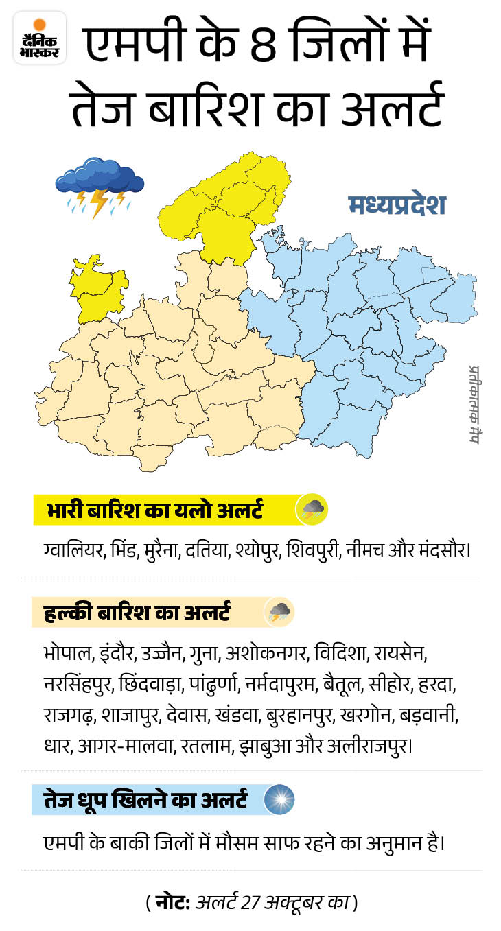 30 अक्टूबर तक ऐसा ही मौसम मौसम विभाग ने 27 से 30 अक्टूबर तक बारिश, गरज-चमक और आंधी का अलर्ट जारी किया है। भोपाल, इंदौर, उज्जैन, नर्मदापुरम और जबलपुर संभाग में असर देखने को मिलेगा।