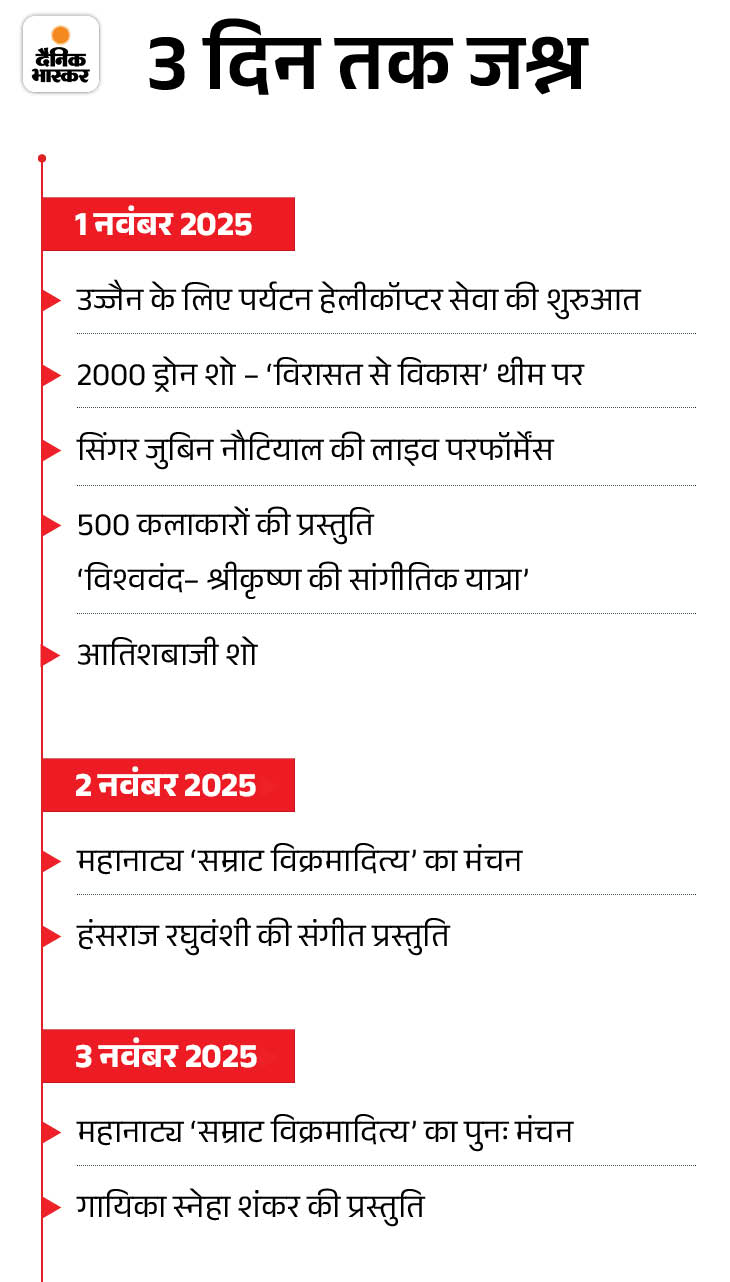 इसके बाद विज्ञान एवं प्रौद्योगिकी विभाग की ओर से 2000 ड्रोन के जरिए ‘‘विरासत से विकास’’ थीम पर देश का सबसे बड़ा ड्रोन शो आयोजित होगा जिसमें आसमान में मध्यप्रदेश की ऐतिहासिक और आधुनिक पहचान दिखाई देगी। रात को लोकप्रिय गायक जुबिन नौटियाल अपने सुपरहिट गीत ‘रातां लम्बियां’, ‘हमनवां मेरे’, ‘तारों के शहर’ जैसे गानों से समां बांधेंगे।