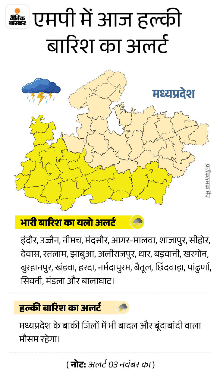 अक्टूबर में 121% बारिश ज्यादा, नवंबर में तेज ठंड का ट्रेंड प्रदेश में नवंबर महीने में पिछले 10 साल से ठंड के साथ बारिश का ट्रेंड भी है। अबकी बार भी ऐसा ही मौसम रहेगा। वहीं, बारिश के लिहाज से अक्टूबर का महीना उम्मीदों पर खरा उतरा है। औसत 2.8 इंच पानी गिर गया, जो सामान्य 1.3 इंच से 121% ज्यादा है।