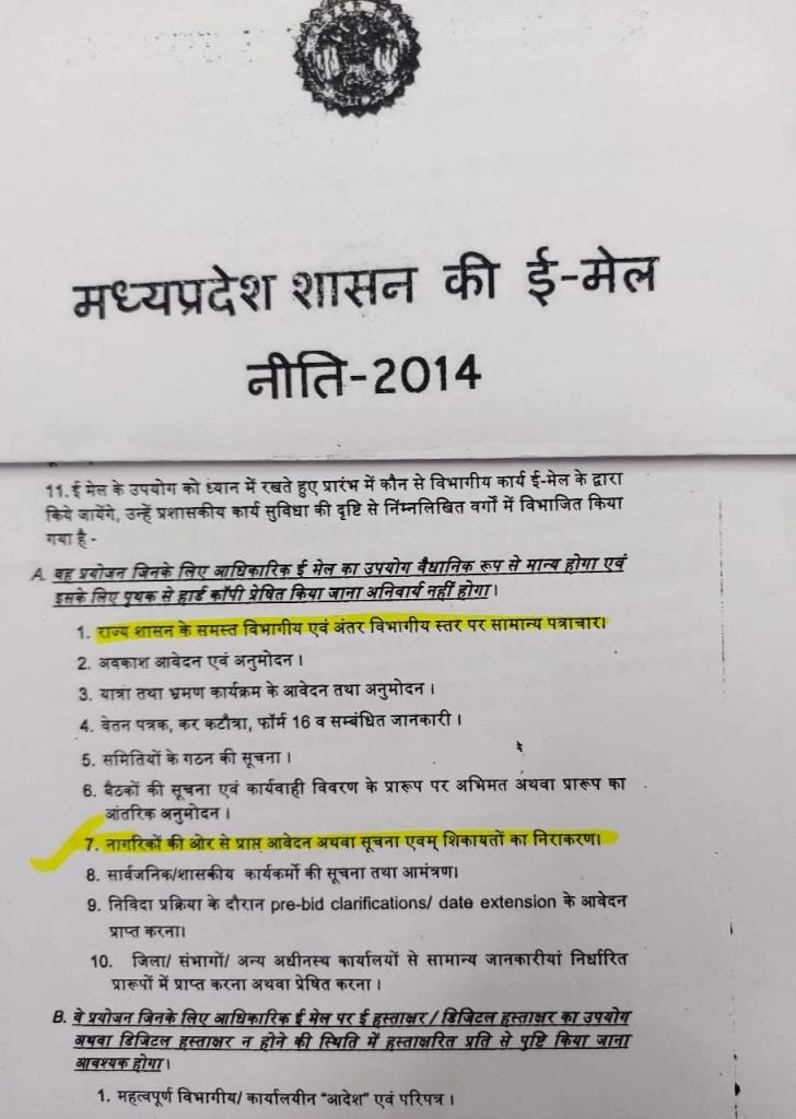 प्रदेश सरकार द्वारा वर्ष 2015 में एक परिपत्र जारी कर शासन के सभी विभागों को निर्देश दिए थे कि ईमेल सेवा ई-मेल नीति 2014 के अनुरूप नागरिकों के लिए उपलब्ध किया जाए इसमें किसी भी तरह की शिकायत उनके आवेदन सूचना एवं ई-मेल से प्राप्त पत्रों पर तत्काल की जाए किंतु कई विभागों में विभागों को दूर प्रदेश में इस परिपत्र आज तक पालन नहीं हुआ है ई-मेल पर मिलने वाली शिकायतें और सूचनाओं पर कोई कार्यवाही भी नहीं हुई है और उन पत्रों का जवाब तक नहीं दिया गया ई-मेल नीति को बीते 8 साल हो चुके हैं इसके कारण पर्यावरण के साथ आर्थिक रूप से भी जो फिजूलखर्ची हो रही रुकेगी और जनता को तुरंत तत्काल न्याय मिलेगा इस परिपत्र का पीडीएफ में आपको जानकारी में दे रहा हूं राधेश्याम अग्रवाल