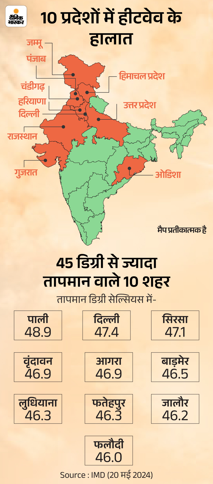 मौसम विभाग के अनुसार पूरे मई 2024 में मध्य प्रदेश, राजस्थान, महाराष्ट्र और गुजरात में 8 से 11 दिन तक हीटवेव की स्थिति रहेगी। आमतौर पर यहां मई में 2-3 दिन ही हीटवेव चलती है। 1901 के बाद 2024 दूसरा ऐसा साल है, जब इतनी भीषण गर्मी पड़ रही है। 21 मई को दिल्ली से सटे नजफगढ़ में रिकॉर्ड 47.8 डिग्री सेल्सियस तापमान दर्ज किया गया।
