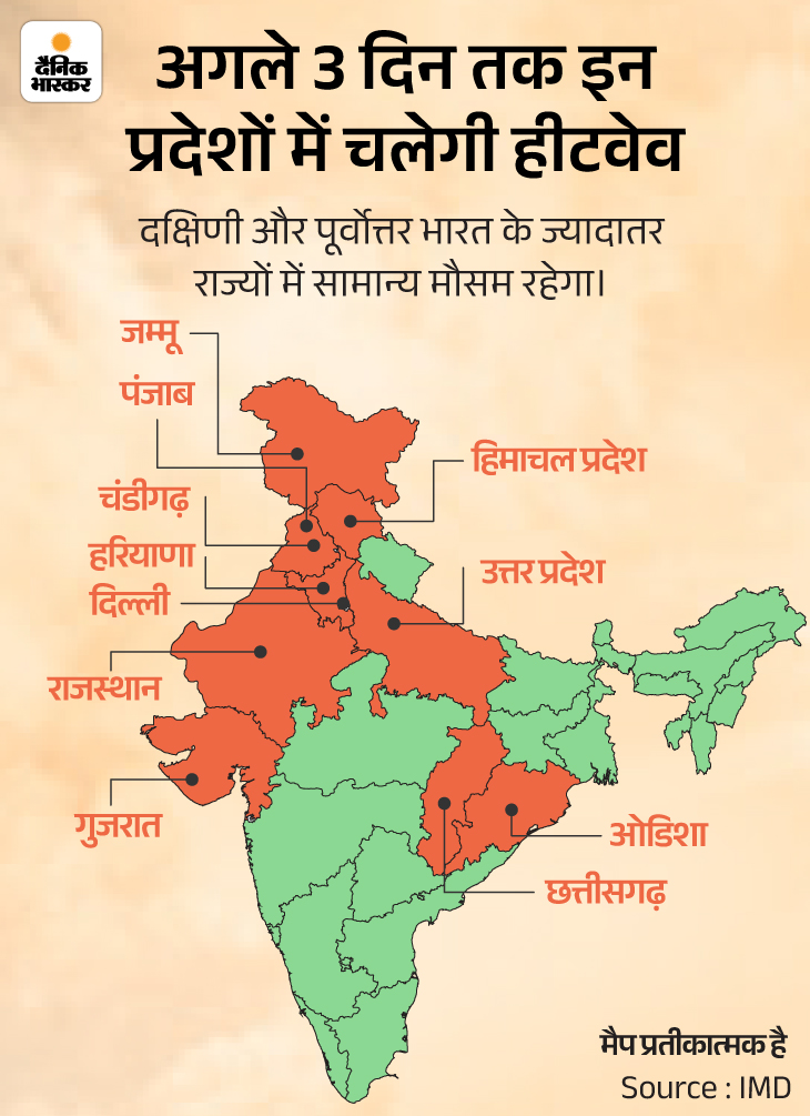 : बीते दो दिनों से हरियाणा, दिल्ली, पंजाब, पश्चिमी उत्तर प्रदेश, राजस्थान, मध्य प्रदेश के पश्चिमी हिस्से और गुजरात में तापमान 43 डिग्री से 47 डिग्री सेल्सियस तक रहा है। वहीं, छत्तीसगढ़, हिमाचल प्रदेश, उत्तराखंड और बिहार के भी ज्यादातर हिस्सों में तापमान 40 डिग्री से 42 डिग्री के रिकॉर्ड किया गया। पंजाब, हरियाणा, दिल्ली, सौराष्ट्र और राजस्थान जैसे क्षेत्रों में 5-6 दिनों से लगातार हीटवेव चल रही है।