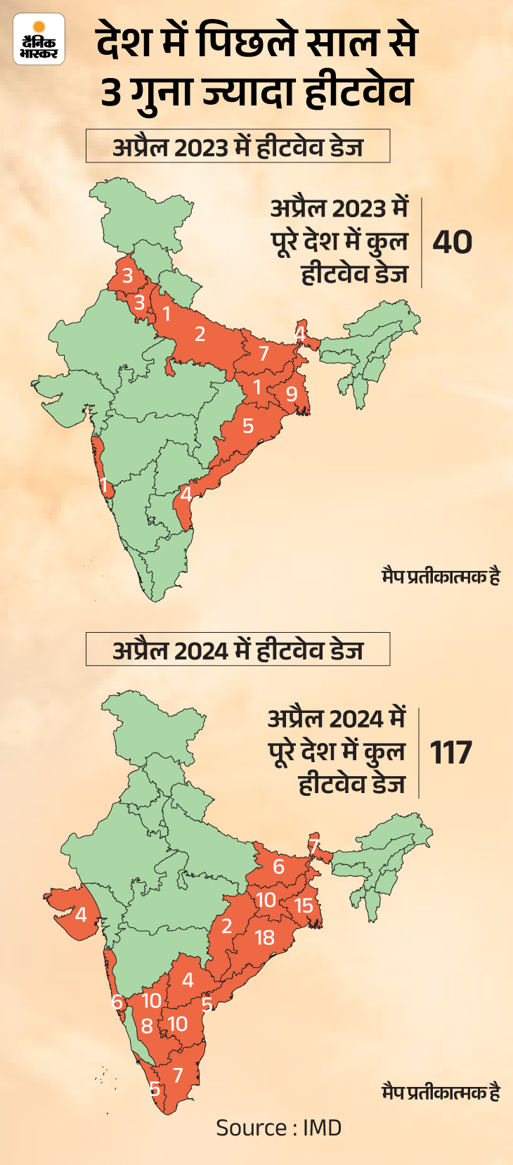 इस साल अप्रैल में पश्चिम बंगाल में बीते 15 साल में और ओडिशा में बीते 9 साल में हीटवेव वाले दिनों की संख्या सबसे ज्यादा रही। ओडिशा में भी साल 2016 के बाद से अब तक इस साल अप्रैल में सबसे ज्यादा 16 दिन तक हीटवेव चली।