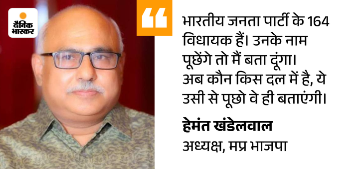 हेमंत खंडेलवाल बोले- भाजपा के 164 विधायक जब प्रदेश भाजपा अध्यक्ष हेमंत खंडेलवाल से पूछा कि निर्मला सप्रे बीजेपी में हैं या नहीं, तो उन्होंने कहा- भारतीय जनता पार्टी के 164 विधायक हैं। उनके नाम पूछेंगे तो मैं बता दूंगा। अब कौन किस दल में हैं ये उसी से पूछो वे ही बताएंगी।