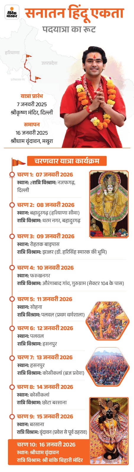 यात्रा से पहले सुबह 9 बजे दिल्ली के कात्यायनी मंदिर परिसर में संत-महात्माओं की उपस्थिति में मंचीय कार्यक्रम आयोजित किया गया। कार्यक्रम के बाद संतों की ओर से सौंपे गए धर्म ध्वज को लेकर बागेश्वर बाबा के नेतृत्व में यात्रा वृंदावन के लिए रवाना हुई।
