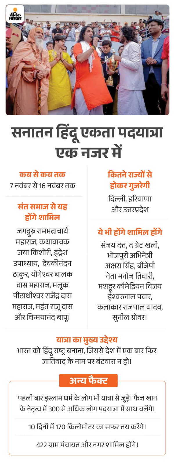 2. राजनीतिक नहीं, आध्यात्मिक पदयात्रा ये राजनीतिक नहीं आध्यात्मिक पदयात्रा है। हम चाहते हैं कि जातियां तो रहें, लेकिन उसका अहंकार न रहें। धर्म विरोधी और देश को बिगाड़ने वालों की ठठरी बंधेगी। भारत में जन्म लेने वाला व्यक्ति सनातनी है। जो सनातनी नहीं, वह तनातनी है।