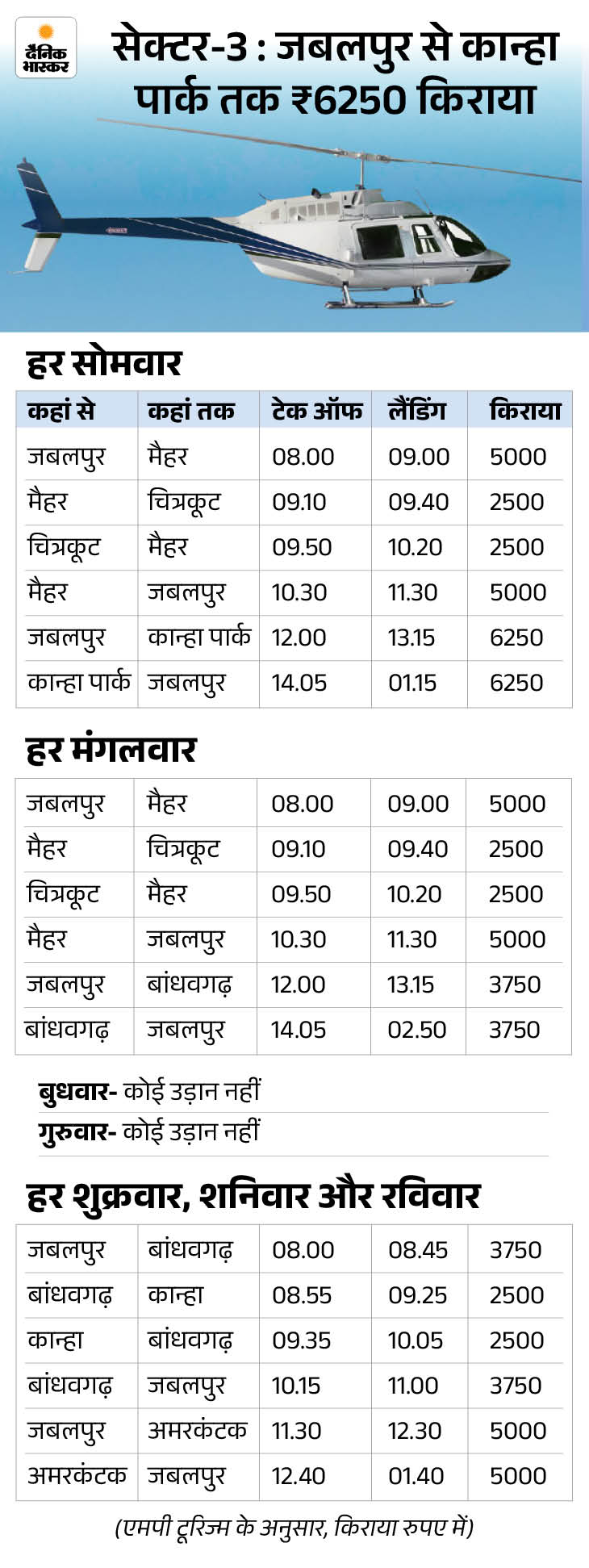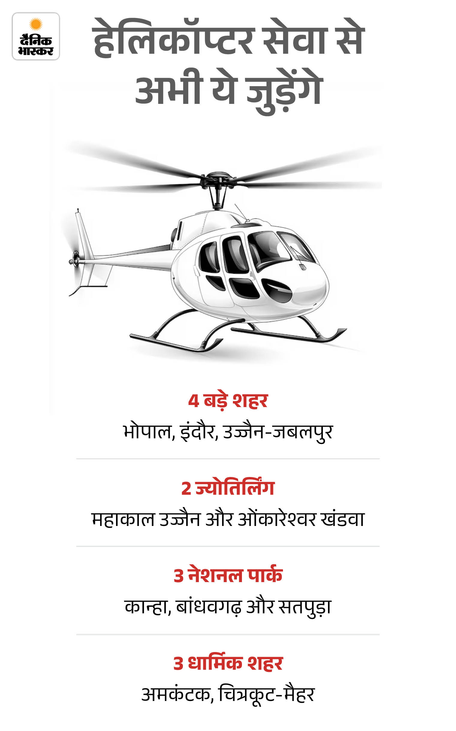 - यानी, दो नेशनल पार्क- कान्हा और बांधवगढ़ टाइगर रिजर्व में हेलिकॉप्टर के जरिए पहुंच सकेंगे तो अमरकंटक, चित्रकूट और मैहर जैसे धार्मिक स्थलों पर भी उड़कर आ-जा सकेंगे।