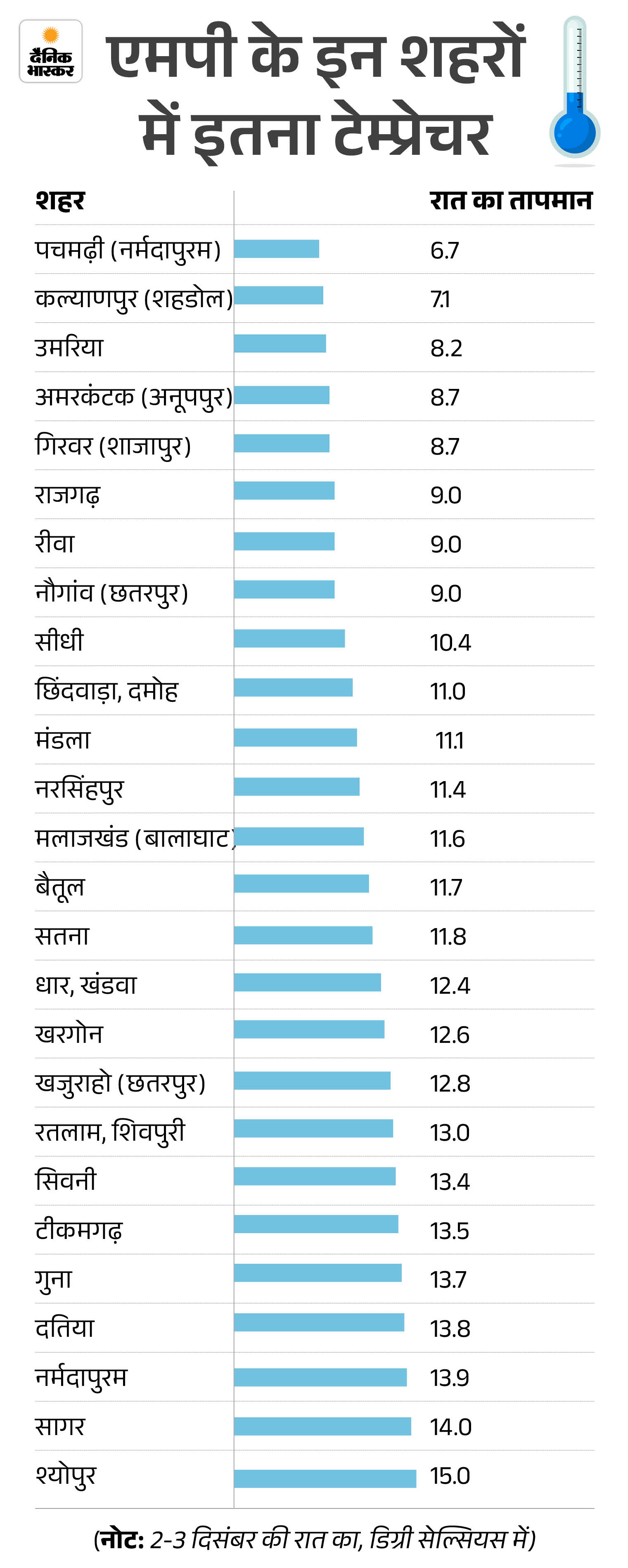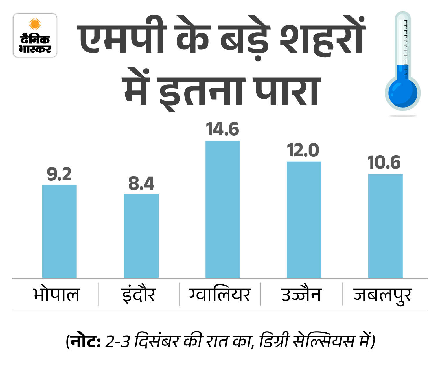 पचमढ़ी सबसे ठंडा, पारा 6.7 डिग्री इससे पहले मंगलवार-बुधवार की रात में भोपाल, इंदौर समेत प्रदेश के 10 शहरों में पारा 10 डिग्री से कम रहा। भोपाल में 9.2 डिग्री, इंदौर में 8.4 डिग्री, जबलपुर में 10.6 डिग्री, उज्जैन में 12 डिग्री और ग्वालियर में 14.6 डिग्री सेल्सियस दर्ज किया गया।