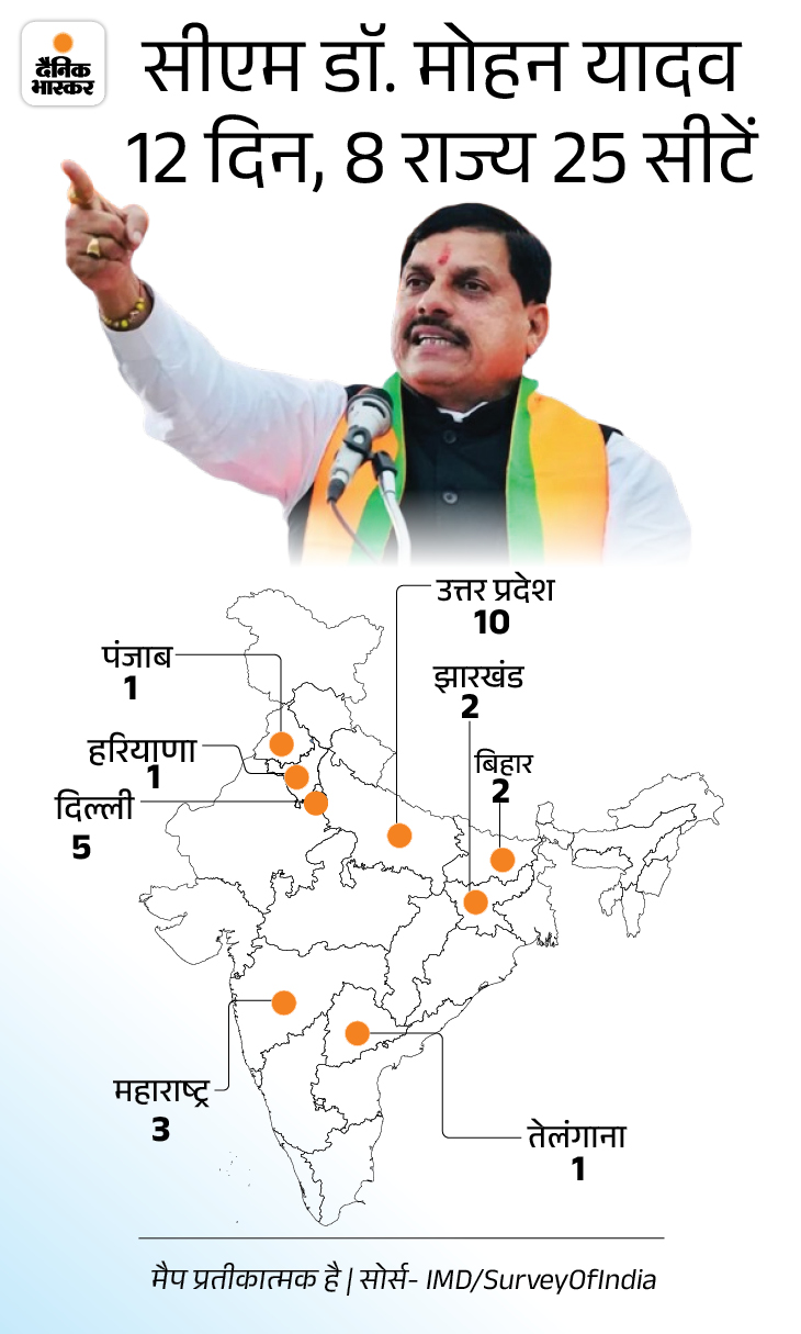 मध्यप्रदेश की 29 लोकसभा सीटों पर चार चरणों में हुए मतदान के बाद सीएम डॉ. मोहन यादव दूसरे राज्यों की सीटों पर प्रचार के लिए गए। डॉ. मोहन यादव ने 14 दिनों में 7 राज्यों की 25 लोकसभा सीटों पर प्रचार किया।