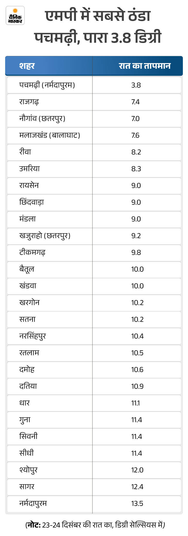 मध्यप्रदेश में ठंड और कोहरे का असर लगातार बढ़ता जा रहा है। प्रदेश के एकमात्र हिल स्टेशन पचमढ़ी में इस सीजन पहली बार न्यूनतम तापमान 4 डिग्री से नीचे पहुंच गया। मंगलवार रात यहां पारा गिरकर 3.8 डिग्री सेल्सियस दर्ज किया गया। मौसम विभाग के मुताबिक, आने वाले दिनों में ठंड और तेज हो सकती है, जिससे लोगों के न्यू ईयर सेलिब्रेशन पर असर पड़ने की आशंका है।