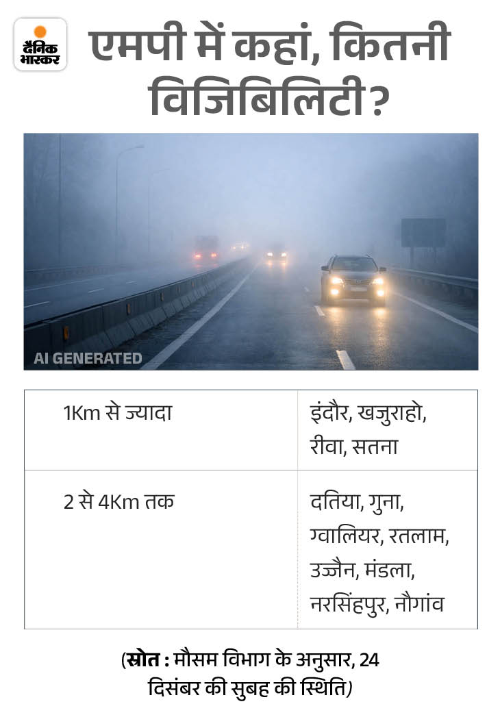 कई शहरों में कोहरे का असर बुधवार सुबह कुछ शहरों में कोहरे से राहत जरूर मिली, लेकिन इंदौर, खजुराहो, रीवा, सतना, दतिया, गुना, ग्वालियर, रतलाम, उज्जैन, मंडला, नरसिंहपुर और नौगांव में घने कोहरे का असर साफ दिखाई दिया। कई जगह विजिबिलिटी 2 से 4 किलोमीटर तक सीमित रही।