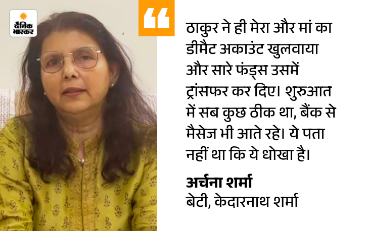 रिलेशनशिप मैनेजर ने दिया धोखा यहीं उनके जीवन में रिलेशनशिप मैनेजर (आरएम) संजय ठाकुर की एंट्री हुई। ठाकुर बैंक की सीनियर सिटिजन सर्विस के तहत घर आकर अपनी सेवाएं देता था। पिताजी की कमजोर याददाश्त के कारण मां ही उससे बात करती थीं और कभी-कभी दुबई से अर्चना भी फोन पर संपर्क में रहती थीं। ठाकुर ने जल्द ही परिवार का भरोसा जीत लिया।