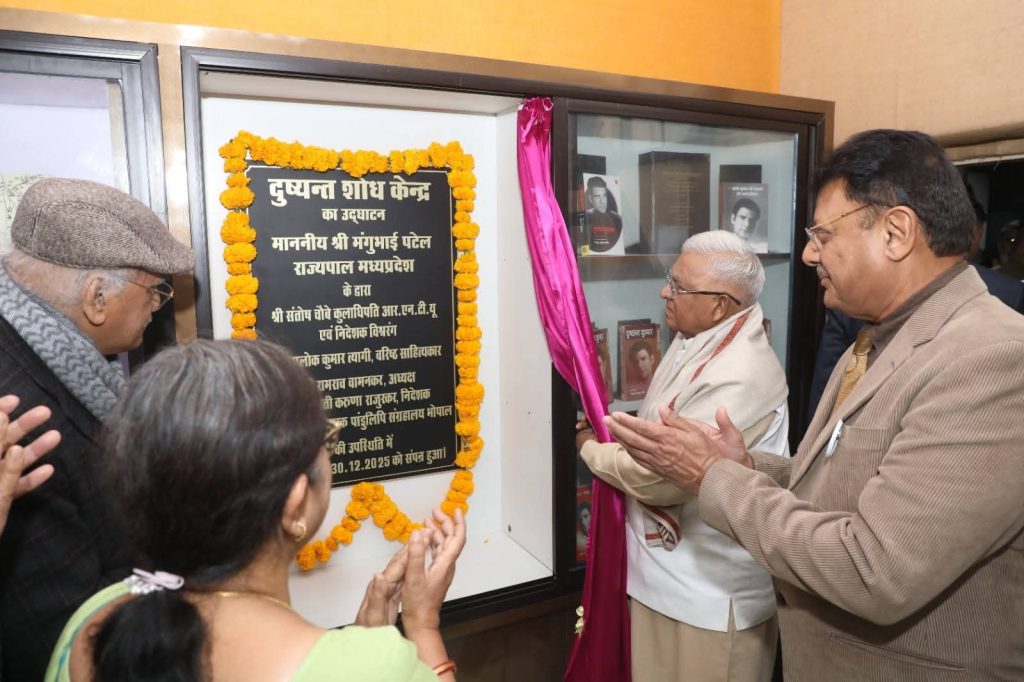 कल 30 दिसंबर 2025 को दुष्यन्त कुमार स्मारक पांडुलिपि संग्रहालय के राज सदन में दुष्यन्त कुमार की 50 वीं पुण्यतिथि और संग्रहालय के 28 में स्थापना दिवस के अवसर पर भव्य कार्यक्रम आयोजित हुआ। इस कार्यक्रम के मुख्य अतिथि थे माननीय राज्यपाल लोक भवन श्री मंगु भाई पटेल, कार्यक्रम के अध्यक्ष थे विश्व रंग के निदेशक श्री संतोष चौबे और विशिष्ट अतिथि थे दुष्यंत कुमार के पुत्र और उनके उत्तराधिकारी श्री आलोक त्यागी । इस अवसर पर माननीय राज्यपाल ने दुष्यन्त शोध केंद्र का उद्घाटन किया और श्री उदय प्रकाश को राष्ट्रीय दुष्यंत अलंकरण ,कांति शुक्ला को सुदीर्घ साहित्य साधना सम्मान और डॉक्टर बहादुर सिंह परमार को बुंदेली के लिए आंचलिक भाषा सम्मान प्रदान किया। इस अवसर पर माननीय राज्यपाल ने श्री जवाहर कर्नावट , श्री अरुण तिवारी और श्री विजय वाजपेई को भी उनके विशिष्ट कार्यों के लिए सम्मानित किया। इस अवसर पर अपने उद्बोधन में माननीय राज्यपाल ने कहा कि वैसे तो कई आयोजनों में मेरा जाना होता है पर इस तरह के साहित्यिक आयोजन में आना मुझे अच्छा लगता है और ऐसे लोगों से जो साहित्य के माध्यम से देश की सेवा कर रहे हैं बार-बार मिलना अच्छा लगता है। इस अवसर पर संग्रहालय के संस्थापक राजुरकर राज को याद करते हुए उन्होंने संग्रहालय के विकास और विस्तार के लिए शुभकामनाएं प्रदान की। कार्यक्रम का संचालन विशाखा राजुरकर ने किया । इस अवसर पर प्रशस्ति वाचन श्री अरविन्द सोनी ने किया। स्वागत उद्बोधन संग्रहालय की निदेशक करुणा राजुरकर ने दिया एवं आभार संग्रहालय के अध्यक्ष रामराव वामनकर जी ने व्यक्त किया। इस अवसर पर माधवराव सप्रे संग्रहालय के संस्थापक पद्मश्री श्री विजय दत्त श्रीधर, श्री अशोक निर्मल,सुश्री शिल्पी दिवाकर ,श्री मनोज मीक,बिहारी लाल सोनी अनुज, वी के श्रीवास्तव ,सुरेश पटवा,घनश्याम मैथिली अमृत , सेवानिवृत जज श्री देवेंद्र जैन, लेखिका संघ की अध्यक्ष श्रीमती साधना गंगराड़े, कुमकुम गुप्ता ,जया आर्य ,मृदुल त्यागी शहर के अनेक गण मान्य नागरिक और साहित्यकार उपस्थित थे ।