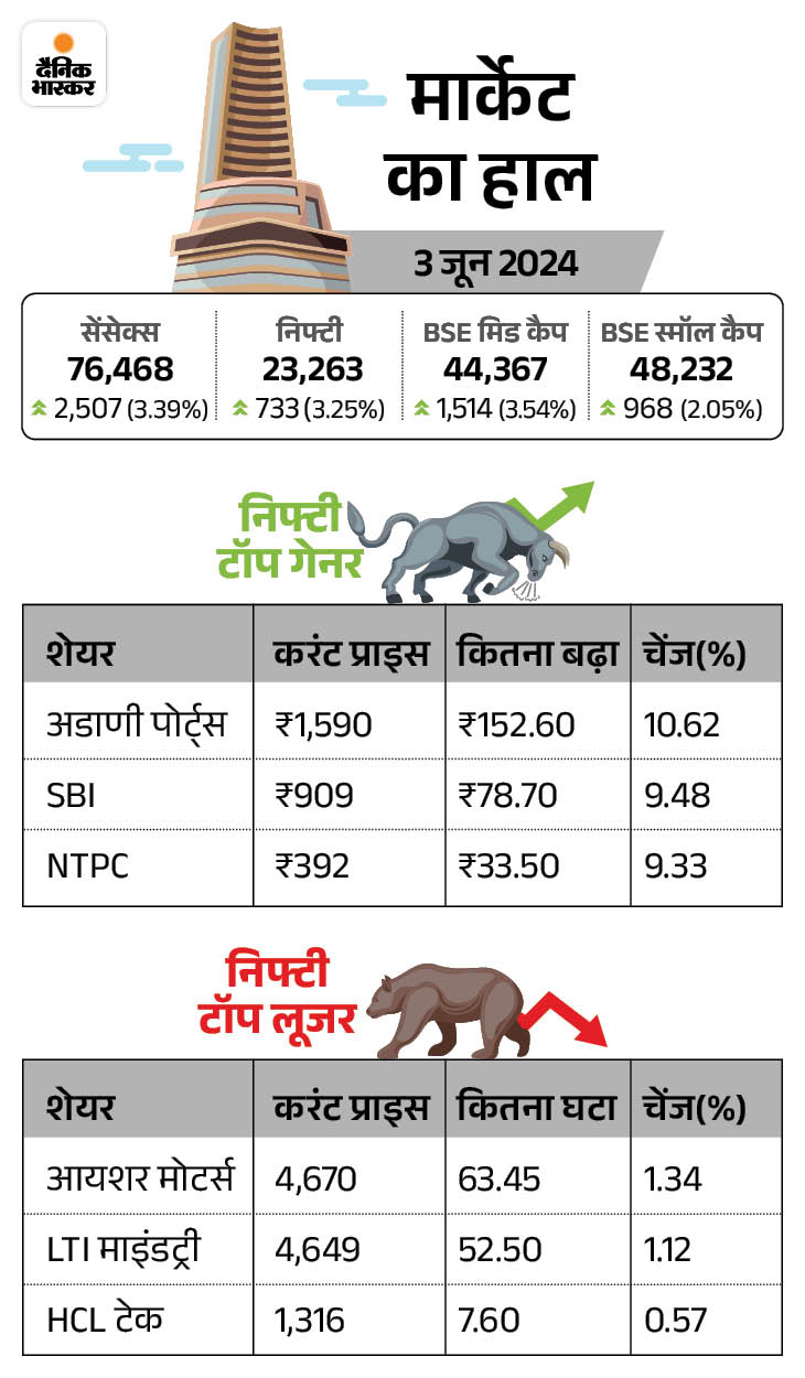 लोकसभा चुनाव नतीजों से एक दिन पहले 3 जून को सेंसेक्स 2,777 पॉइंट की तेजी के साथ 76,738 और निफ्टी 808 पॉइंट चढ़कर 23,338 पर पहुंच गया था। हालांकि, बाद में बाजार अपने ऊपरी स्तरों से थोड़ा नीचे आया और सेंसेक्स 2,507 पॉइंट चढ़कर 76,468 के स्तर पर बंद हुआ था। वहीं निफ्टी 733 पॉइंट चढ़ा और 23,263 के स्तर पर बंद हुआ था।
