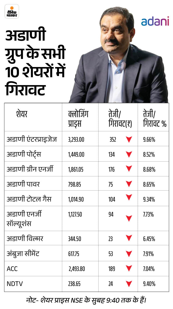 अडाणी एंटरप्राइजेज का शेयर सबसे ज्यादा 9.66% टूटा
