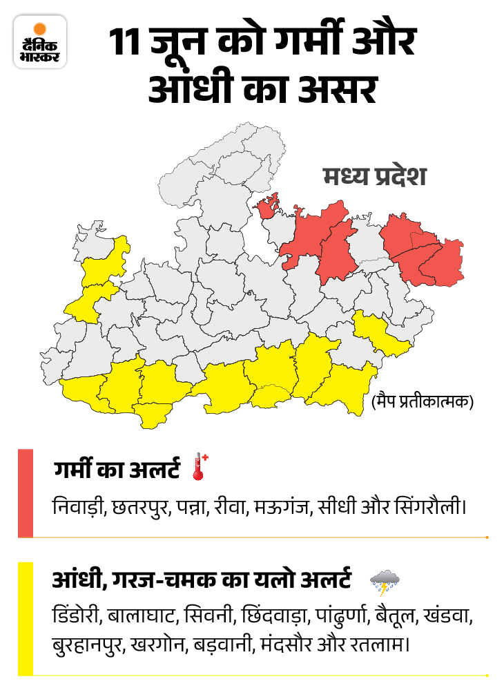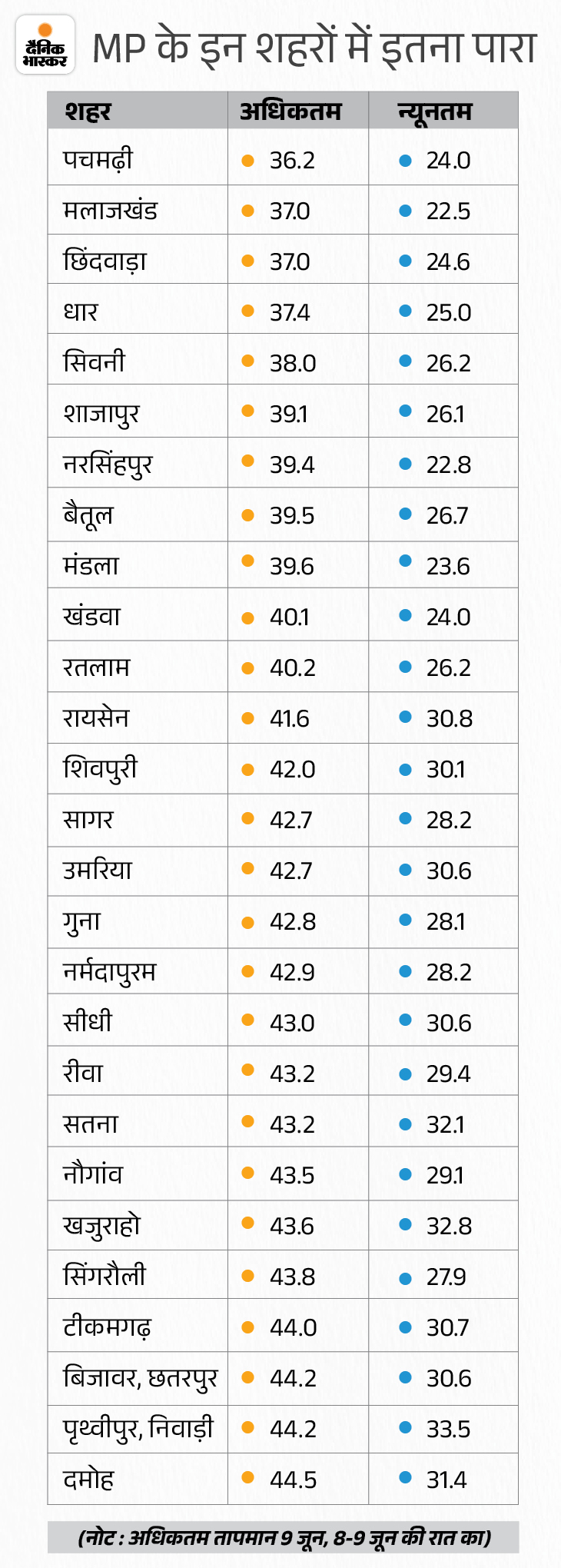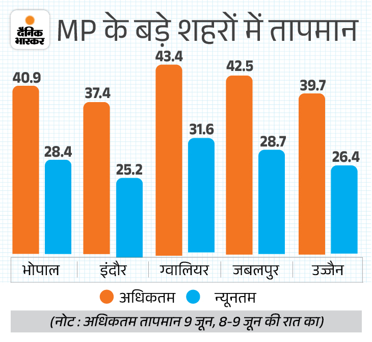- बड़े शहरों की बात करें तो भोपाल में 40.9 डिग्री, इंदौर में 37.4 डिग्री, जबलपुर में 42.5 डिग्री और उज्जैन में तापामन 39.7 डिग्री दर्ज किया गया। पचमढ़ी में पारा सबसे कम 36.2 डिग्री दर्ज किया गया। मलाजखंड-छिंदवाड़ा में 37 डिग्री और धार में 37.4 डिग्री रहा।