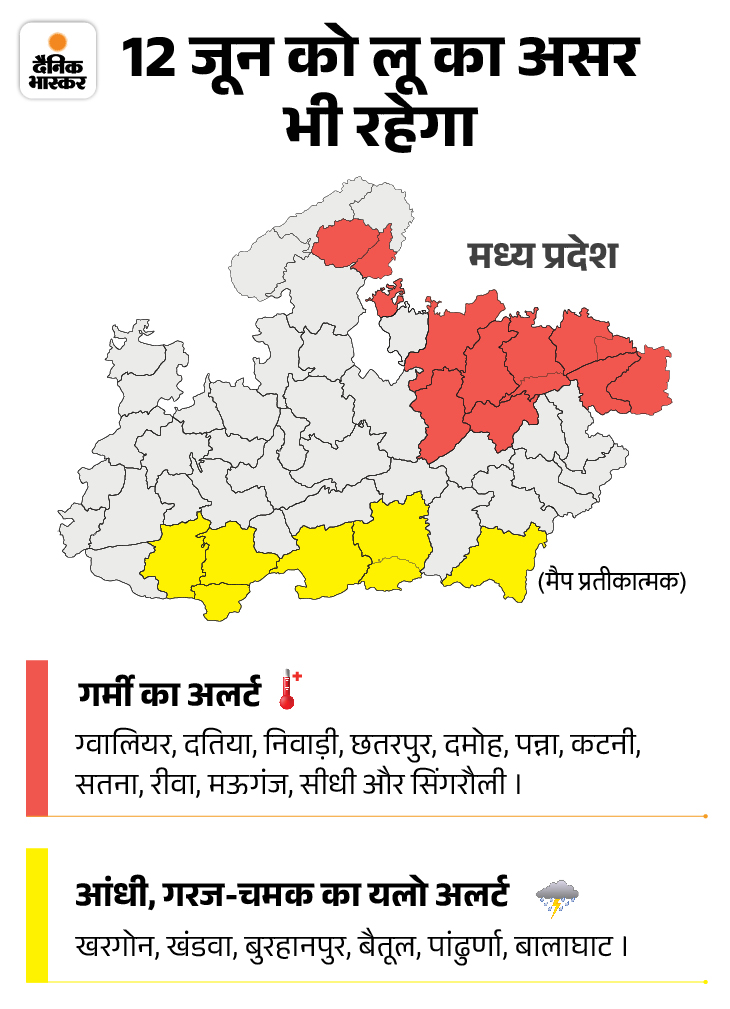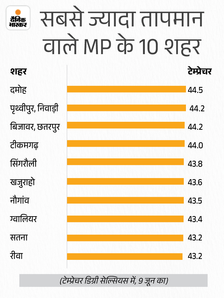 - दमोह सबसे गर्म रहा। यहां दिन का तापमान 44.5 डिग्री रहा। निवाड़ी के पृथ्वीपुर और छतरपुर के बिजावर में टेम्प्रेचर 44.2 डिग्री दर्ज किया गया। प्रदेश के टॉप-10 सबसे गर्म शहरों में टीकमगढ़ में 44 डिग्री, सिंगरौली में 43.8 डिग्री, खजुराहो में 43.6 डिग्री, नौगांव में 43.5 डिग्री, ग्वालियर में 43.4 डिग्री, सतना और रीवा में पारा 42.2 डिग्री दर्ज किया गया।