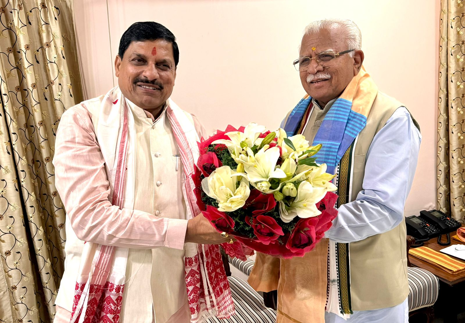 मुख्यमंत्री डॉ. मोहन यादव ने सोमवार सुबह हरियाणा स्टेट गेस्ट हाउस में केंद्रीय मंत्री मनोहर लाल खट्टर से मुलाकात कर केंद्रीय मंत्रिपरिषद में चुने जाने पर बधाई दी।