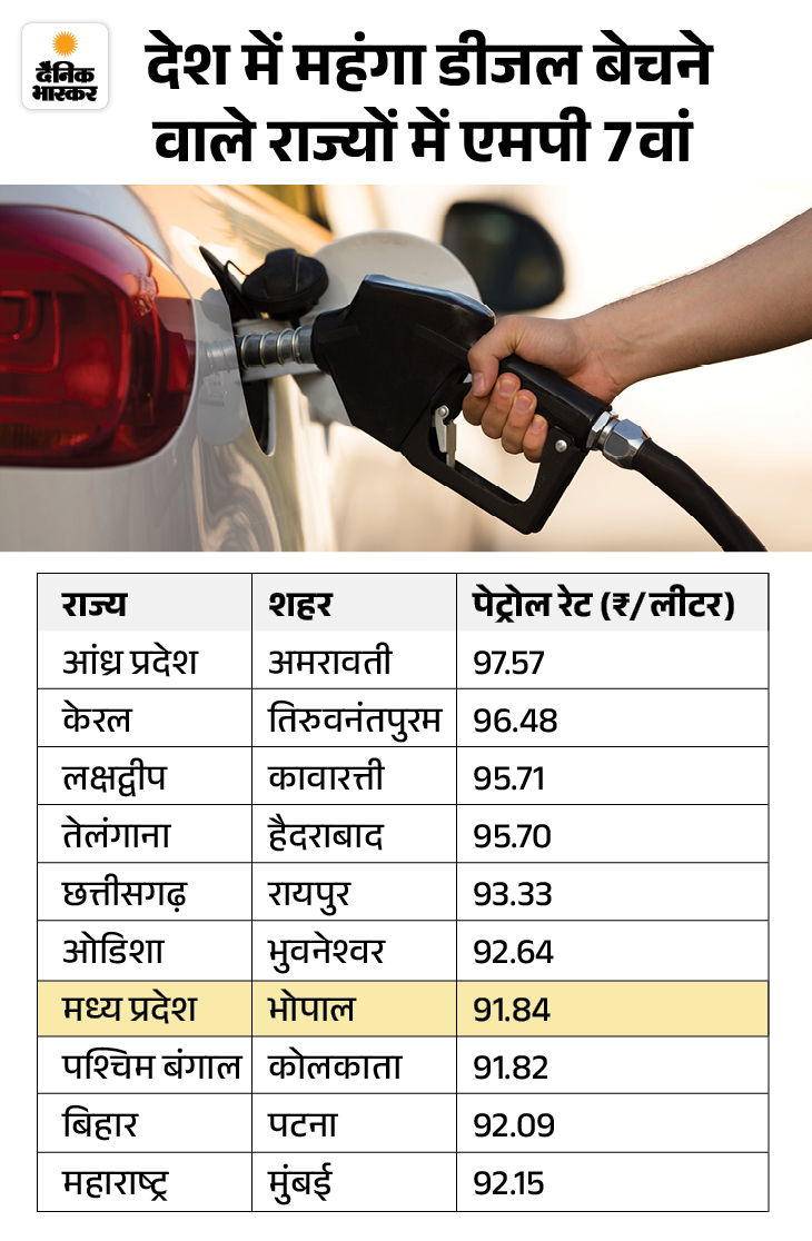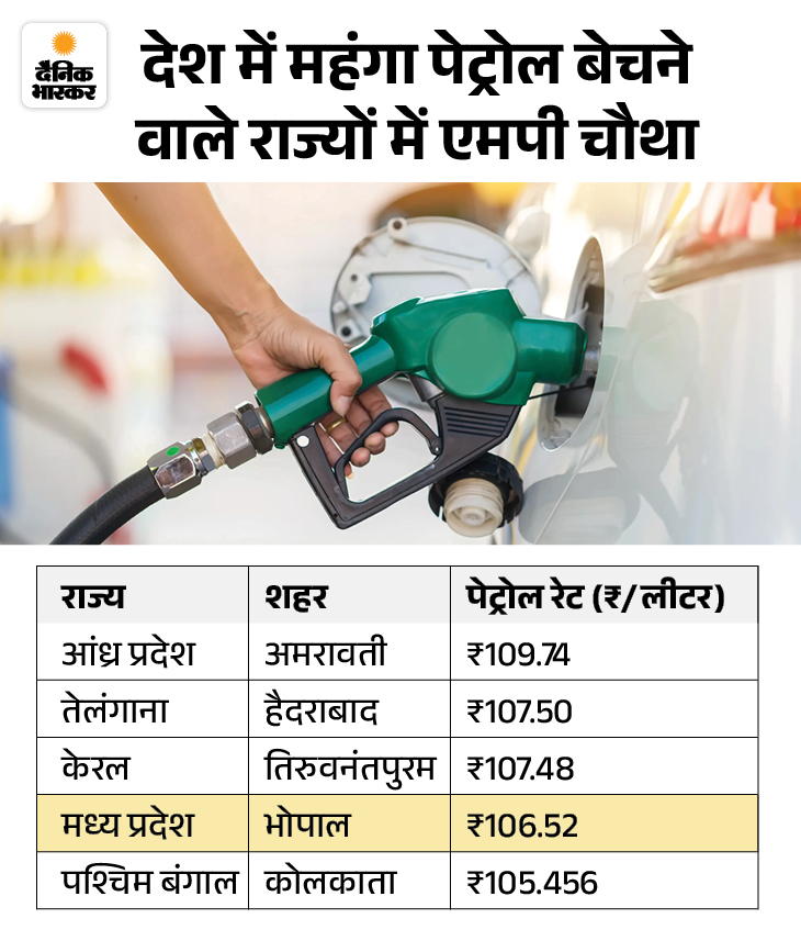 मध्य प्रदेश में रहने वालों के लिए पेट्रोल भरवाना देश के अधिकांश राज्यों की तुलना में काफी महंगा सौदा साबित हो रहा है। राज्यसभा में पेट्रोलियम और प्राकृतिक गैस मंत्रालय द्वारा सोमवार को पेश किए गए ताजा आंकड़ों (11 मार्च 2026 तक) के विश्लेषण से पता चला है कि मध्य प्रदेश देश का चौथा ऐसा राज्य है जहां पेट्रोल की कीमतें सबसे अधिक हैं। राजधानी भोपाल में पेट्रोल की कीमत ₹106.52 प्रति लीटर तक पहुंच गई है।एमपी के पड़ोसी राज्यों में 11 रुपए तक सस्ता बिक रहा पेट्रोलएमपी के पड़ोसी राज्य उत्तर प्रदेश (लखनऊ) में पेट्रोल केवल ₹94.69 और गुजरात (गांधीनगर) में ₹94.70 प्रति लीटर मिल रहा है। गुजरात, उत्तर प्रदेश की राजधानियों में पेट्रोल के रेट को देखें तो करीब 11 रुपए सस्ता पेट्रोल मिल रहा है।एमपी से सटे दूसरे पड़ोसी राज्यों छत्तीसगढ़ की राजधानी रायपुर में ₹99.44 रुपए प्रति लीटर, महाराष्ट्र के मुंबई में ₹103.54 प्रति लीटर और राजस्थान में ₹104.72 रुपए प्रति लीटर पेट्रोल मिल रहा है।