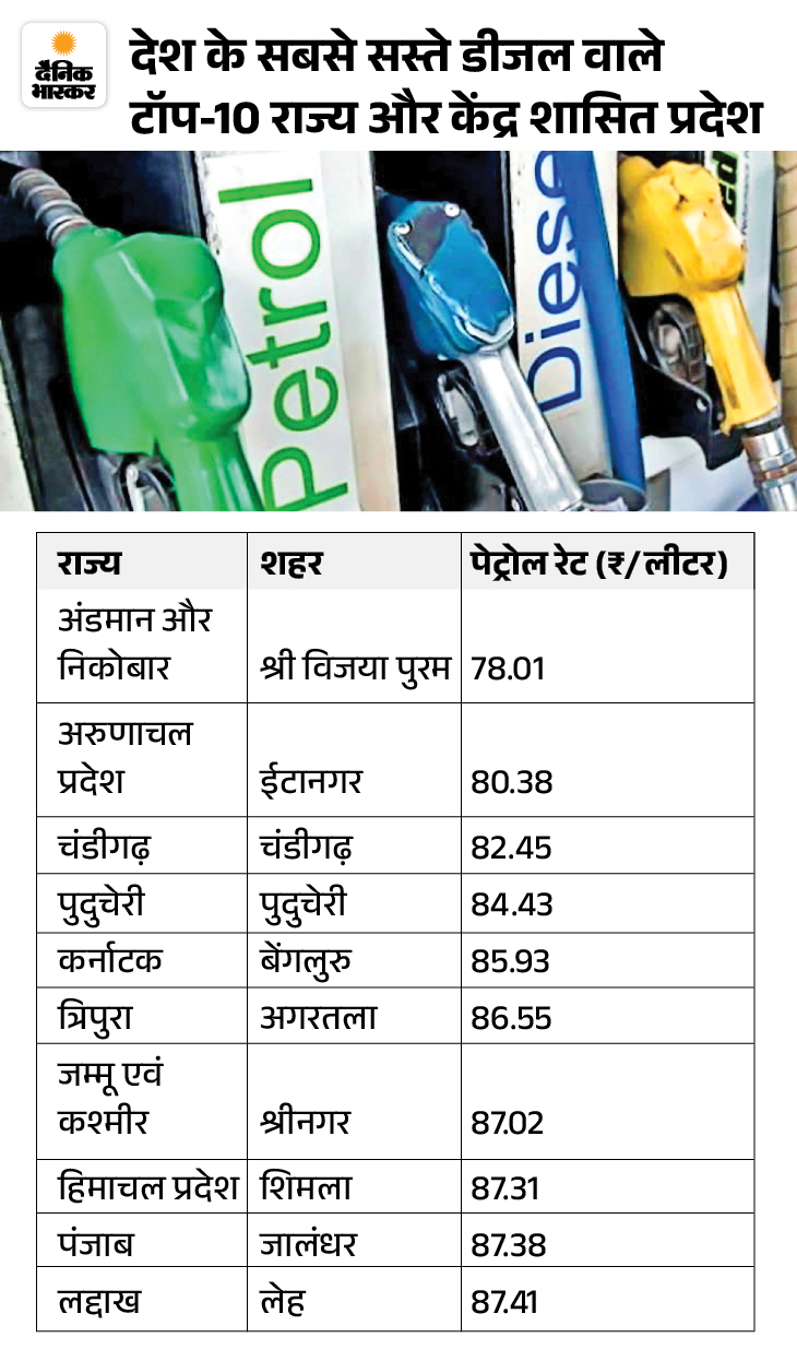 | जिला | पेट्रोल (₹/लीटर) | डीजल (₹/लीटर) |