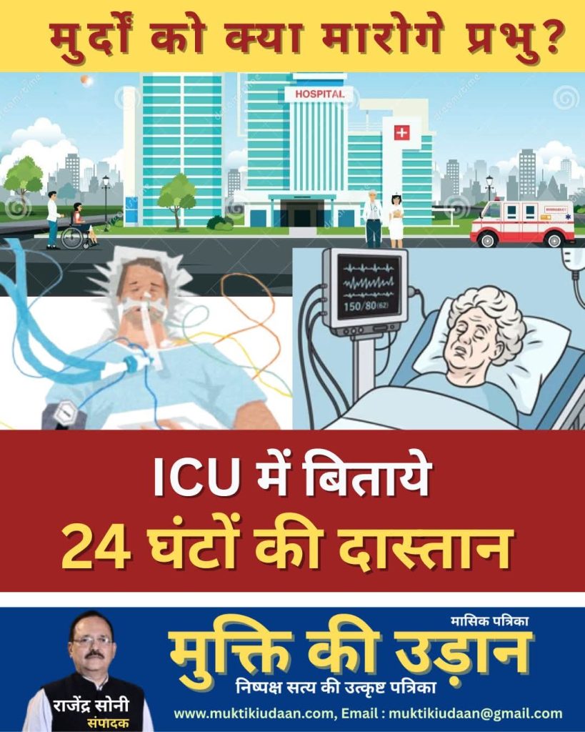 जिंदगी चल रही थी जैसी लगभग सबकी ही चलती है, वही पैदाइश ,बचपन, ज्ञान नहीं बल्कि नौकरी / व्यवसाय के लिये स्कूल, कॉलेज जाना, फिर रोजगारोन्मुखी शिक्षा ले के जीवनयापन के लिये नौकरी या व्यवसाय करना I पैसे , ओहदे, इज्जत के पीछे अंधी दौड़, शादी , बच्चे, परिवार, यार रिश्तेदारों के गम और खुशी में सम्मिलित होना, बस इसी सबको जीवन मानकर सुखी होने के दिखावे का कार्यक्रम चल ही रहा था कि एक दिन अचानक सीने में दर्द उठा और मैं सीधा एक बड़े से फाइव स्टार अस्पताल के इमरजेंसी मे खड़ा था, ECG निकाला गया, और मुझे ICU ( कार्डियक केयर यूनिट ) पहुंचा दिया गया, , प्राइवेट कॉलेज के 2 – 3 करोड़ रुपए में बने भृष्टाचारी मां – बाप के प्रशिक्षु डॉक्टर और मध्य प्रदेश के लापता प्राइवेट नर्सिंग कॉलेज से पढ़ी लिखी सजी – संवरी नर्सों ने मुझे घेर लिया, कई इंजेक्शन घुसेड दिय गये, बॉटल चढ़ा दी गयी, पेशाब में नली और मुंह में मास्क पहना दिया गया, इको, डॉप्लर पता नहीं क्या क्या ?
