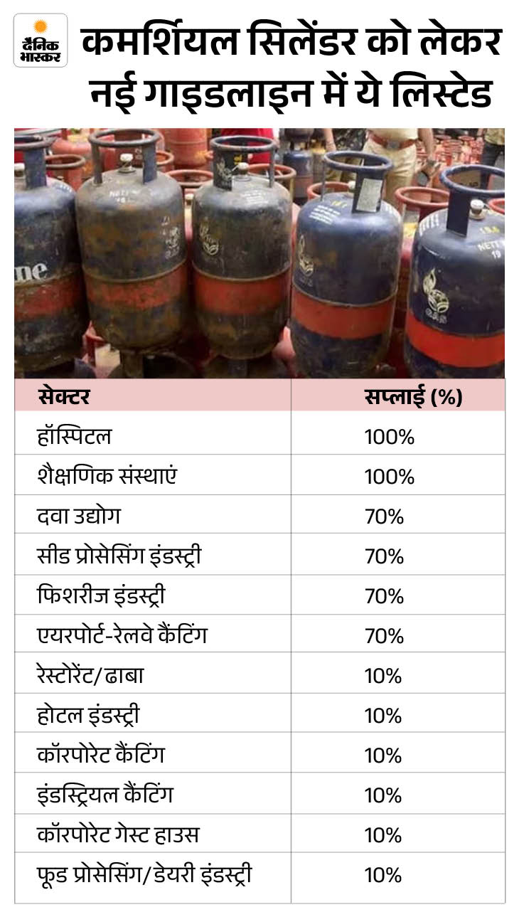 गाइडलाइन आई, आदेश का इंतजार कमर्शियल सिलेंडर की सप्लाई को लेकर मंगलवार को ऑयल कंपनियों की नई गाइडलाइन आई। जिसमें 12 कैटेगिरी को कमर्शियल सिलेंडर देने की बात कही गई है। इनमें रेस्टोरेंट, होटल और ढाबों को खपत की 10% आपूर्ति भी शामिल हैं। फूड कंट्रोलर जादौन ने बताया कि विस्तृत आदेश आएंगे, तब सप्लाई शुरू कर देंगे।