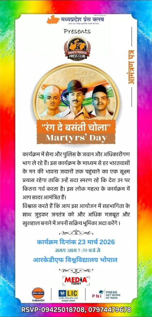 рдордзреНрдп рдкреНрд░рджреЗрд╢ рдкреНрд░реЗрд╕ рдХреНрд▓рдм рд╕рджреИрд╡ рди рдХреЗрд╡рд▓ рдкрддреНрд░рдХрд╛рд░рд┐рддрд╛ рдХреЗ рдЙрдиреНрдирдпрди рдФрд░ рд╡рд┐рдХрд╛рд╕ рд╣реЗрддреБ рд╕рдорд░реНрдкрд┐рдд рд░рд╣рд╛ рд╣реИ, рдмрд▓реНрдХрд┐ рд╕рд╛рдорд╛рдЬрд┐рдХ рд╕рд░реЛрдХрд╛рд░, рд░рд╛рд╖реНрдЯреНрд░рднрдХреНрддрд┐ рдФрд░ рдЬрдирд╕реЗрд╡рд╛ рдХреЗ рдореВрд▓реНрдпреЛрдВ рдХреЛ рднреА рдЕрдкрдиреЗ рдХрд╛рд░реНрдпреЛрдВ рдХреЗ рдХреЗрдВрджреНрд░ рдореЗрдВ рд░рдЦрддрд╛ рдЖрдпрд╛ рд╣реИред рдЗрд╕реА рдкрд░рдВрдкрд░рд╛ рдХреЛ рдЖрдЧреЗ рдмрдврд╝рд╛рддреЗ рд╣реБрдП рдЖрдЬ рджрд┐рдирд╛рдВрдХ 23 рдорд╛рд░реНрдЪ рдХреЛ рдЕрдорд░ рд╢рд╣реАрдж рднрдЧрдд рд╕рд┐рдВрд╣, рд░рд╛рдЬрдЧреБрд░реБ рдПрд╡рдВ рд╕реБрдЦрджреЗрд╡ рдХреЗ рдмрд▓рд┐рджрд╛рди рджрд┐рд╡рд╕ рдкрд░ рдПрдХ рд╡рд┐рд╢реЗрд╖ рдХрд╛рд░реНрдпрдХреНрд░рдо тАЬрд░рдВрдЧ рджреЗ рдмрд╕рдВрддреА рдЪреЛрд▓рд╛тАЭ рдХрд╛ рдЖрдпреЛрдЬрди рдХрд┐рдпрд╛ рдЬрд╛ рд░рд╣рд╛ рд╣реИред
