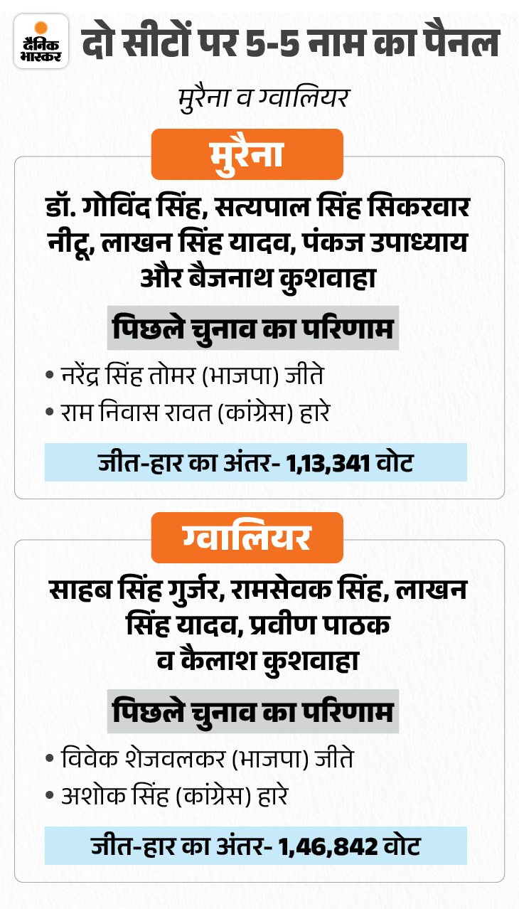 इसी तरह मंदसौर सीट से विपिन जैन (विधायक, मंदसौर) का नाम पैनल में है। मुरैना सीट से 5 नामों में जौरा विधायक पंकज उपाध्याय व पूर्व नेता प्रतिपक्ष डॉ. गोविंद सिंह का नाम भी शामिल किया गया है।