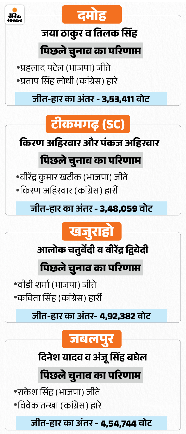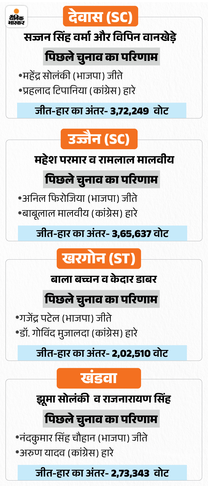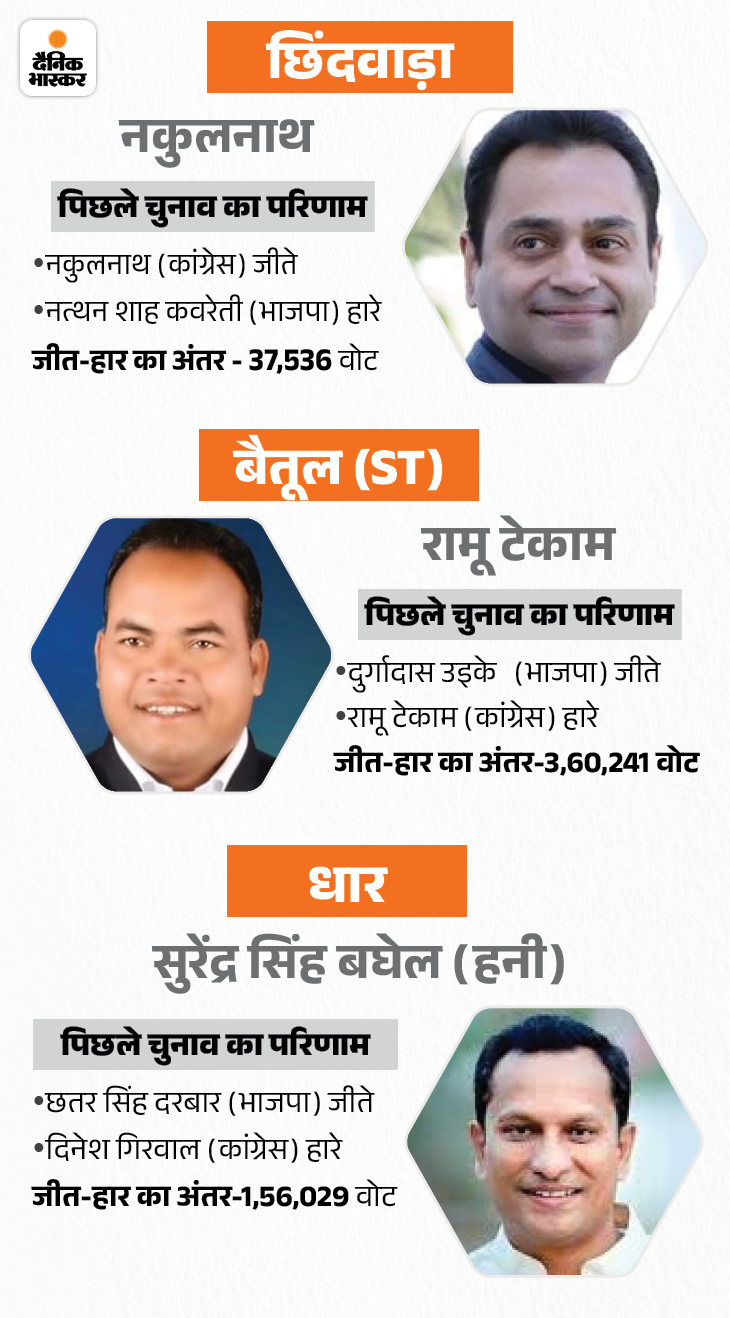 रतलाम-झाबुआ सीट से कांग्रेस एक बार फिर कांतिलाल भूरिया पर दांव लगा सकती है। वे पिछला चुनाव जीएस डामोर से हार गए थे, लेकिन पूर्व विधायक जेवियर मेड़ा और हर्ष विजय गहलोत का नाम भी पैनल में है। बावजूद भूरिया पर कांग्रेस दांव लगा सकती है। इसी तरह, नर्मदापुरम से पूर्व विधायक संजय शर्मा को एक बार फिर मौका मिल सकता है। वे विधानसभा चुनाव तेंदूखेड़ा से हार गए थे।