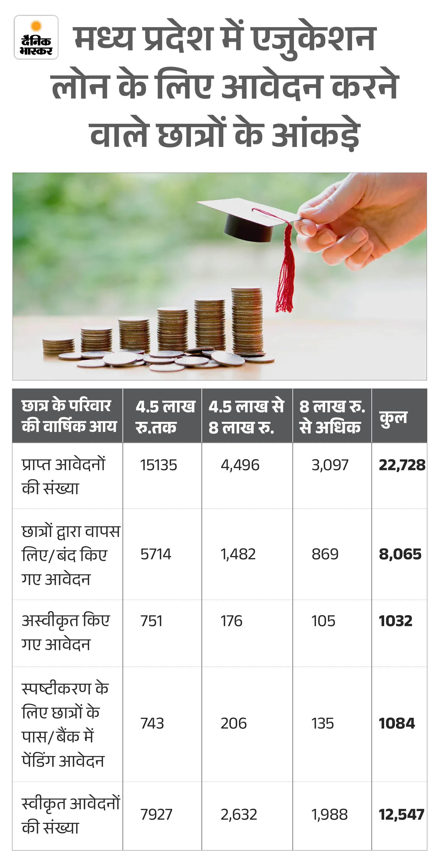 सबसे चौंकाने वाली संख्या उन आवेदनों की है जो बंद कर दिए गए या वापस ले लिए गए। मध्य प्रदेश में ऐसे 8,065 आवेदन हैं, जो संकेत देते हैं कि जटिल प्रक्रिया या देरी के कारण छात्रों ने उम्मीद छोड़ दी। कुल 22,728 आवेदकों में से मात्र 12,547 को ही लोन मिल सका, यानी करीब 45% छात्र खाली हाथ रहे।
