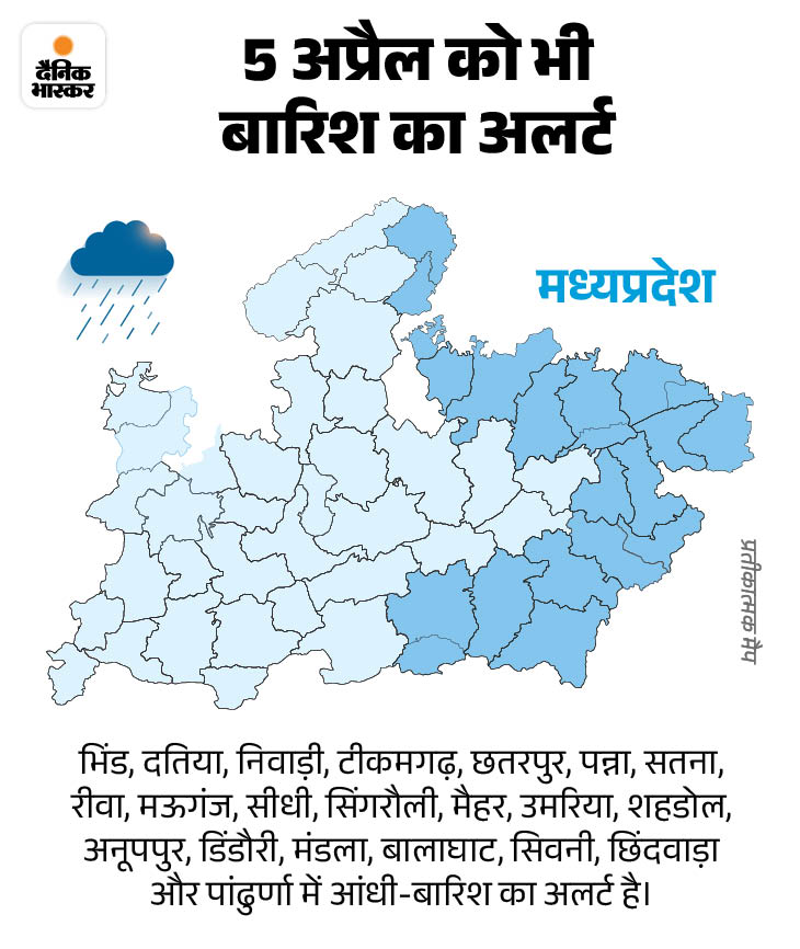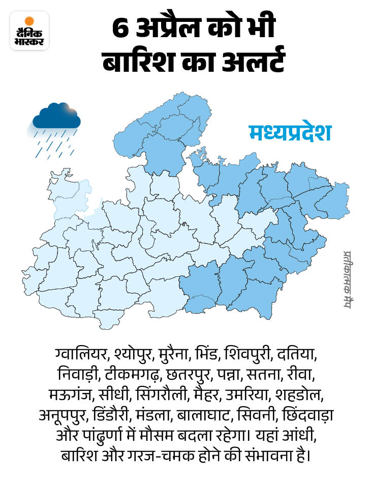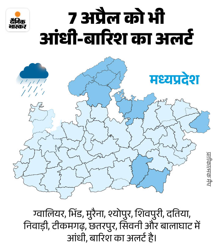 मध्य प्रदेश में सिस्टम की एक्टिविटी देखने को मिल रही है। 7 अप्रैल से एक वेस्टर्न डिस्टरबेंस (पश्चिमी विक्षोभ) भी सक्रिय होगा। इसकी वजह से 10 अप्रैल तक कहीं आंधी चलेगी तो कहीं बारिश हो सकती है।