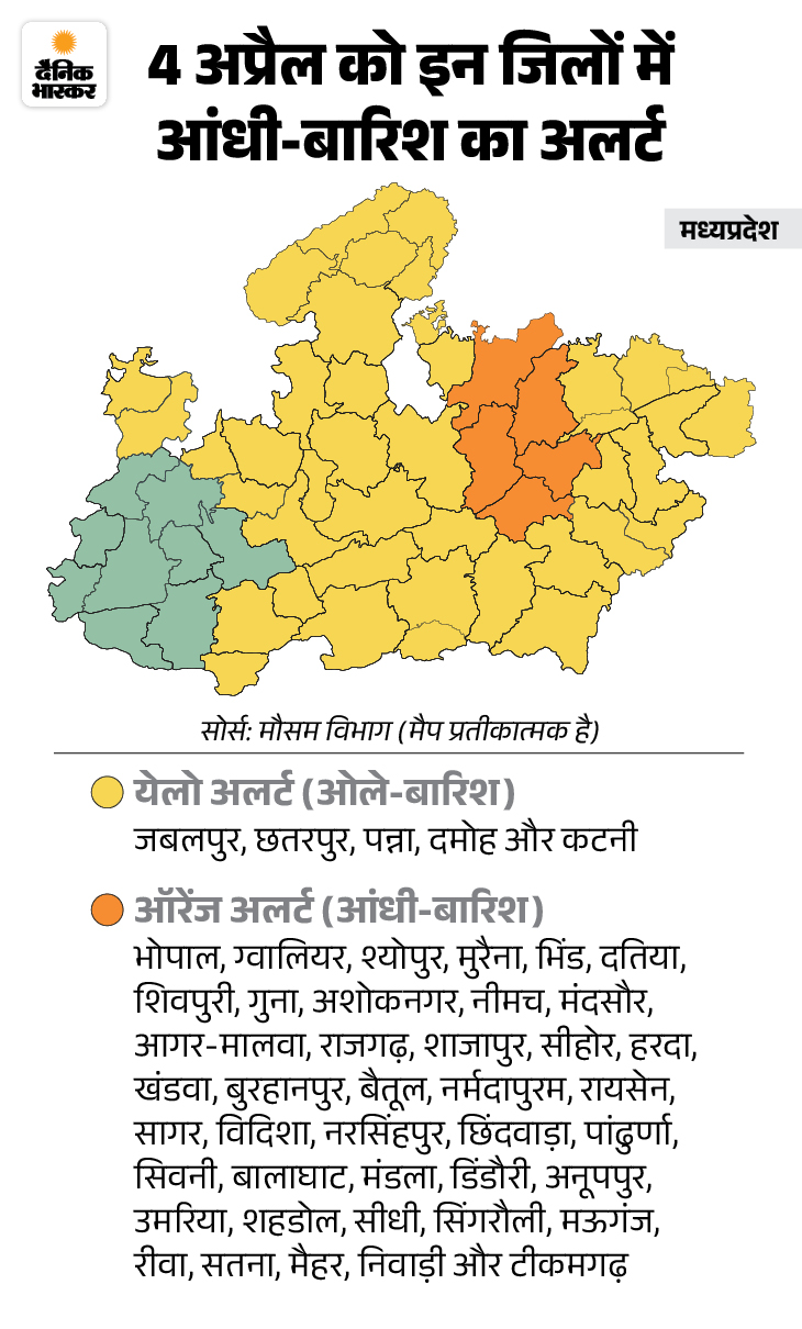 आज जबलपुर, छतरपुर, पन्ना, दमोह और कटनी में ओले-बारिश का अलर्ट है। वहीं, भोपाल, ग्वालियर, श्योपुर, मुरैना, भिंड, दतिया, शिवपुरी, गुना, अशोकनगर, नीमच, मंदसौर, आगर-मालवा, राजगढ़, शाजापुर, सीहोर, हरदा, खंडवा, बुरहानपुर, बैतूल, नर्मदापुरम, रायसेन, सागर, विदिशा, नरसिंहपुर, छिंदवाड़ा, पांढुर्णा, सिवनी, बालाघाट, मंडला, डिंडौरी, अनूपपुर, उमरिया, शहडोल, सीधी, सिंगरौली, मऊगंज, रीवा, सतना, मैहर, निवाड़ी और टीकमगढ़ में आंधी, बारिश और गरज-चमक का दौर बना रह सकता है।
