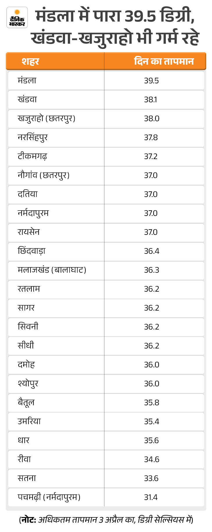 वहीं, दतिया, मुरैना, श्योपुर, बड़वानी, खरगोन, धार का तापमान भी बढ़ेगा। दरअसल, अप्रैल महीने में प्रदेश के दक्षिणी और पश्चिमी हिस्से में गर्म हवाएं चलती हैं। इस वजह से यहां भीषण गर्मी पड़ती है।