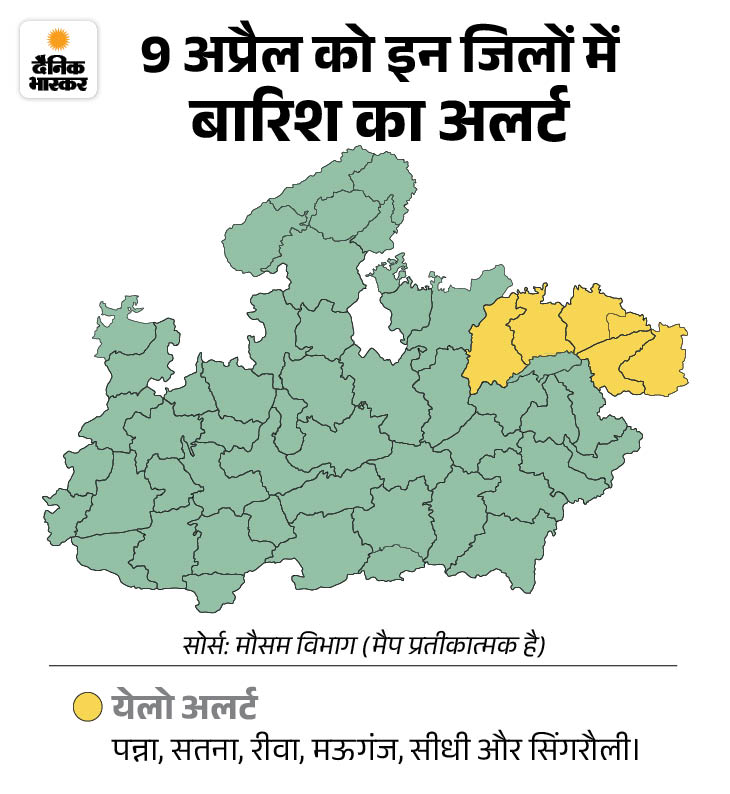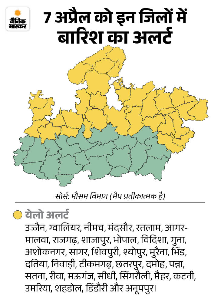 मध्य प्रदेश में अगले 4 दिन यानी, 9 अप्रैल तक आंधी-बारिश का दौर जारी रहेगा। टर्फ के सक्रिय होने से सोमवार को ग्वालियर-चंबल, जबलपुर, रीवा और शहडोल और सागर संभाग के 24 जिलों में असर बना रहेगा। IMD (मौसम केंद्र), भोपाल के अनुसार, 7 अप्रैल से नया सिस्टम एक्टिव हो रहा है।