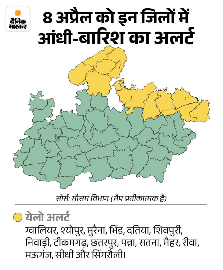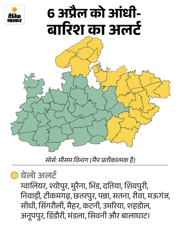 सोमवार को जिन जिलों में आंधी, बारिश और गरज-चमक का अलर्ट है, उनमें ग्वालियर, श्योपुर, मुरैना, भिंड, दतिया, शिवपुरी, निवाड़ी, टीकमगढ़, छतरपुर, पन्ना, सतना, रीवा, मऊगंज, सीधी, सिंगरौली, मैहर, कटनी, उमरिया, शहडोल, अनूपपुर, डिंडौरी, मंडला, सिवनी और बालाघाट शामिल है।