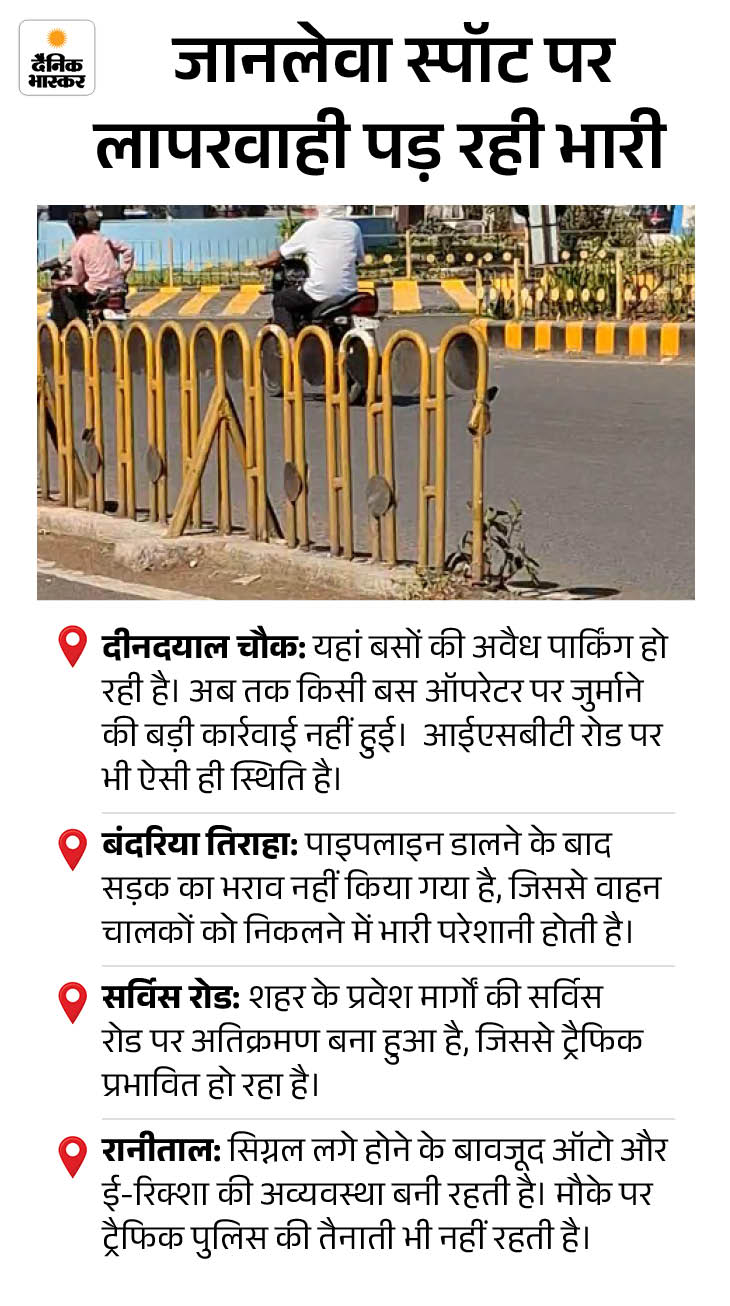 शहर के सबसे खतरनाक चौराहों में रानीताल चौराहा शीर्ष पर है, जहां आए दिन हादसे हो रहे हैं। इसके अलावा बलदेवबाग और उखरी तिराहा भी दुर्घटनाओं के लिहाज से संवेदनशील हैं। इन स्थानों पर ट्रैफिक सिग्नल लगाने के निर्देश तो दिए गए, लेकिन अब तक स्थिति में सुधार नहीं हो पाया है।