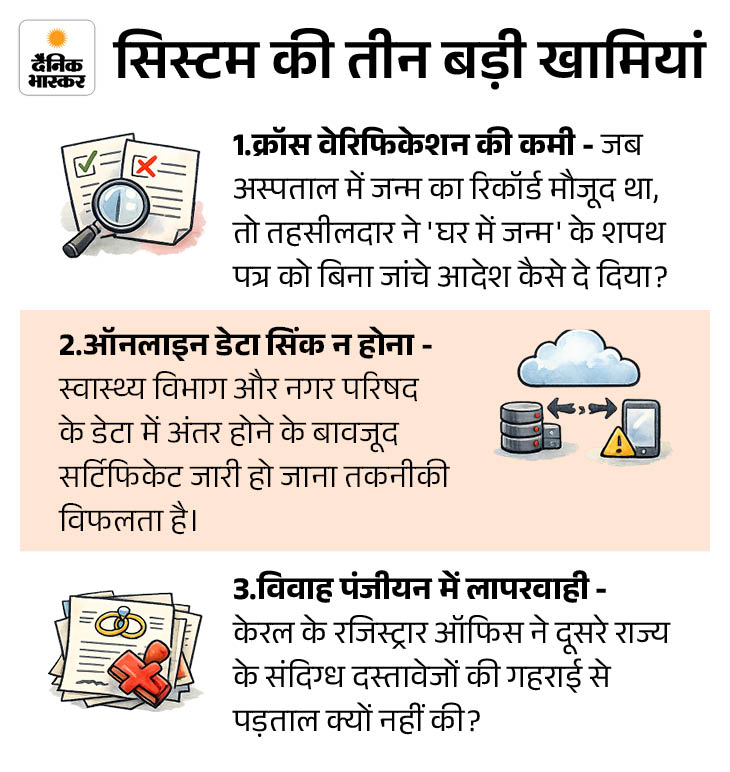 अस्पताल का रिकॉर्ड: बीएमओ डॉ. अतुल गौर ने कहा कि जन्म शासकीय अस्पताल में हुआ था और रिकॉर्ड 2009 से मौजूद है। नियमानुसार, ऐसे में नगर परिषद को ‘घर में जन्म’ का प्रमाण पत्र जारी करने का अधिकार नहीं था। यह दस्तावेजों की जालसाजी का मामला है।