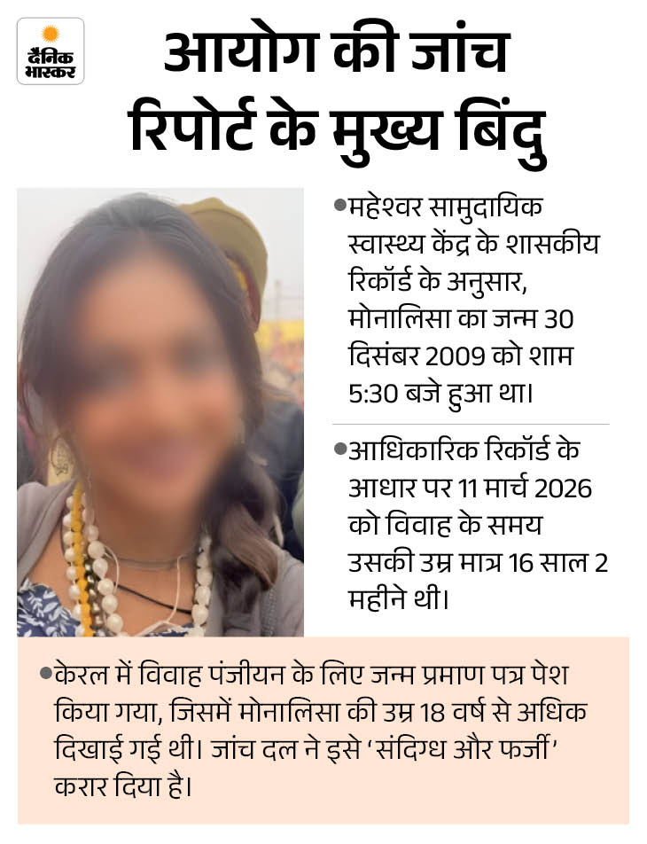 शिकायत के बाद आयोग की टीम ने जांच की। महेश्वर अस्पताल रिकॉर्ड में लड़की का जन्म 30 दिसंबर 2009 दर्ज मिला। 11 मार्च 2026 को शादी के समय उसकी उम्र 16 साल 2 महीने थी।