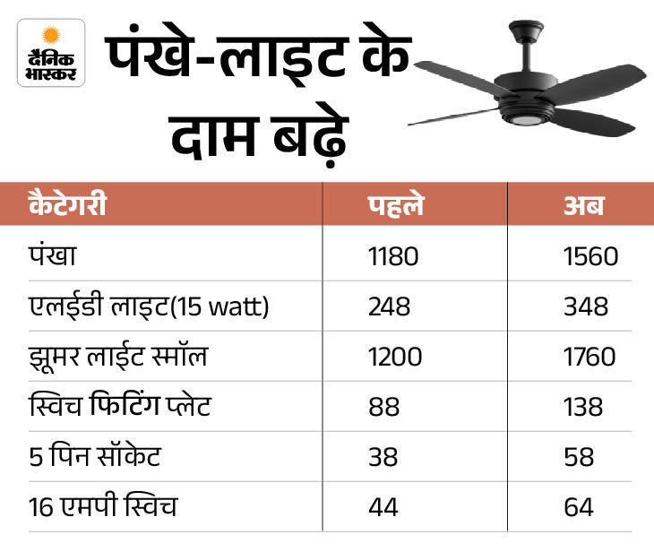 पंखे, एलईडी और स्विच प्लेट्स की कीमतों में औसतन 400 से 500 रुपए की बढ़ोतरी हुई है। रामनानी के मुताबिक जो काम पहले 10 लाख में हो रहा था, अब 15 लाख में हो रहा है। कॉपर और एल्युमिनियम में तेजी है। बाजार में कैश फ्लो की कमी है। आने वाले दिनों में दाम और बढ़ेंगे।