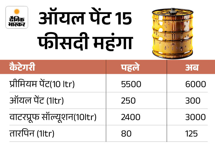 4. रंग रोगन करवाना भी हुआ महंगा इंदौर सियागंज के पेंट्स कारोबारी गुलाम अली के अनुसार कच्चे माल के रेट रोज बढ़ रहे हैं। कंपनी लेवल पर प्रीमियम सेगमेंट के प्रोडक्ट के रेट में करीब 50 रुपए प्रति लीटर बढ़ोतरी हुई है। रेट बढ़ने के साथ सप्लाई भी शॉर्ट है। सप्लाई पूरी नहीं हो पा रही है।