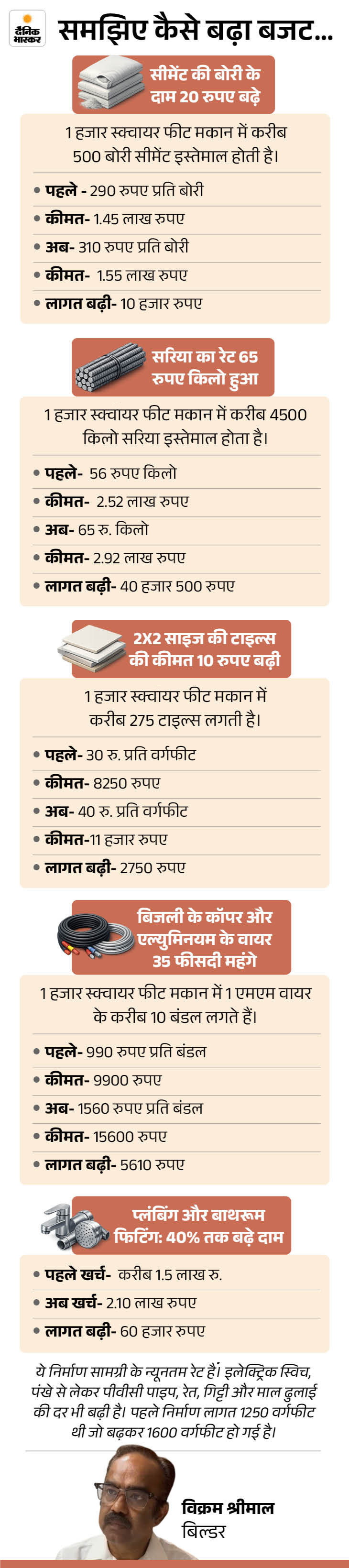 1 हजार स्क्वायर फीट पर लागत 3.5 लाख रुपए बढ़ी इंदौर की एक निजी कंपनी के कर्मचारी रमेश कुमार ने पिछले साल 1000 वर्गफीट का घर बनाने की योजना बनाई थी। उस समय अनुमानित लागत 12.5 लाख रुपए थी। लेकिन निर्माण के आखिरी चरण तक पहुंचते-पहुंचते यह लागत बढ़कर 16 लाख रुपए से अधिक हो गई। यानी करीब 3.5 लाख रुपए का अतिरिक्त बोझ उन पर आ गया।