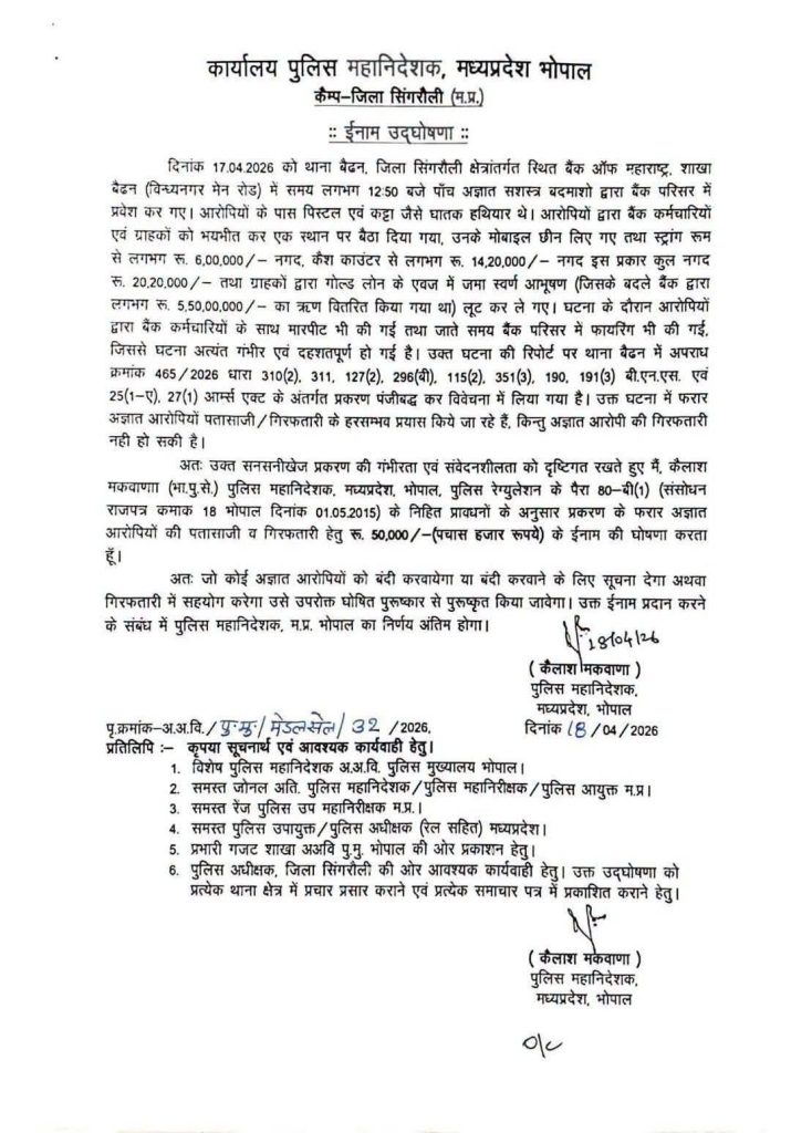 Uncategorized सिंगरौली बैंक लूट मामले में डीजीपी मुख्यालय कैलाश मकवाना ने फरार और आरोपियों पर घोषित किया ₹50000 का इनाम admin April 18, 2026 0 Spread the love Post navigation Previous: *थाना छोला मंदिर पुलिस में गांजा तस्करों को गिरफ्तार कर गांजा किया बरामद l*Next: दिव्यांगो का फैशन शो More Stories Uncategorized सिंगरौली में बैंक ऑफ महाराष्ट्र डकैती कांड में पुलिस को बड़ी सफलता मिली admin April 18, 2026 0 Uncategorized एक ऐसा शब्द, जो सुनने में जितना सधा हुआ लगता है, उतना ही भीतर से उलझा हुआ है। admin April 18, 2026 0 Uncategorized *डॉ. मोहन यादव क्यों नहीं बन पा रहे उतने लोकप्रिय? एक समीक्षा?* admin April 18, 2026 0 Leave a Reply Cancel replyYour email address will not be published. Required fields are marked *Comment * Name * Email * Website Save my name, email, and website in this browser for the next time I comment. Δ